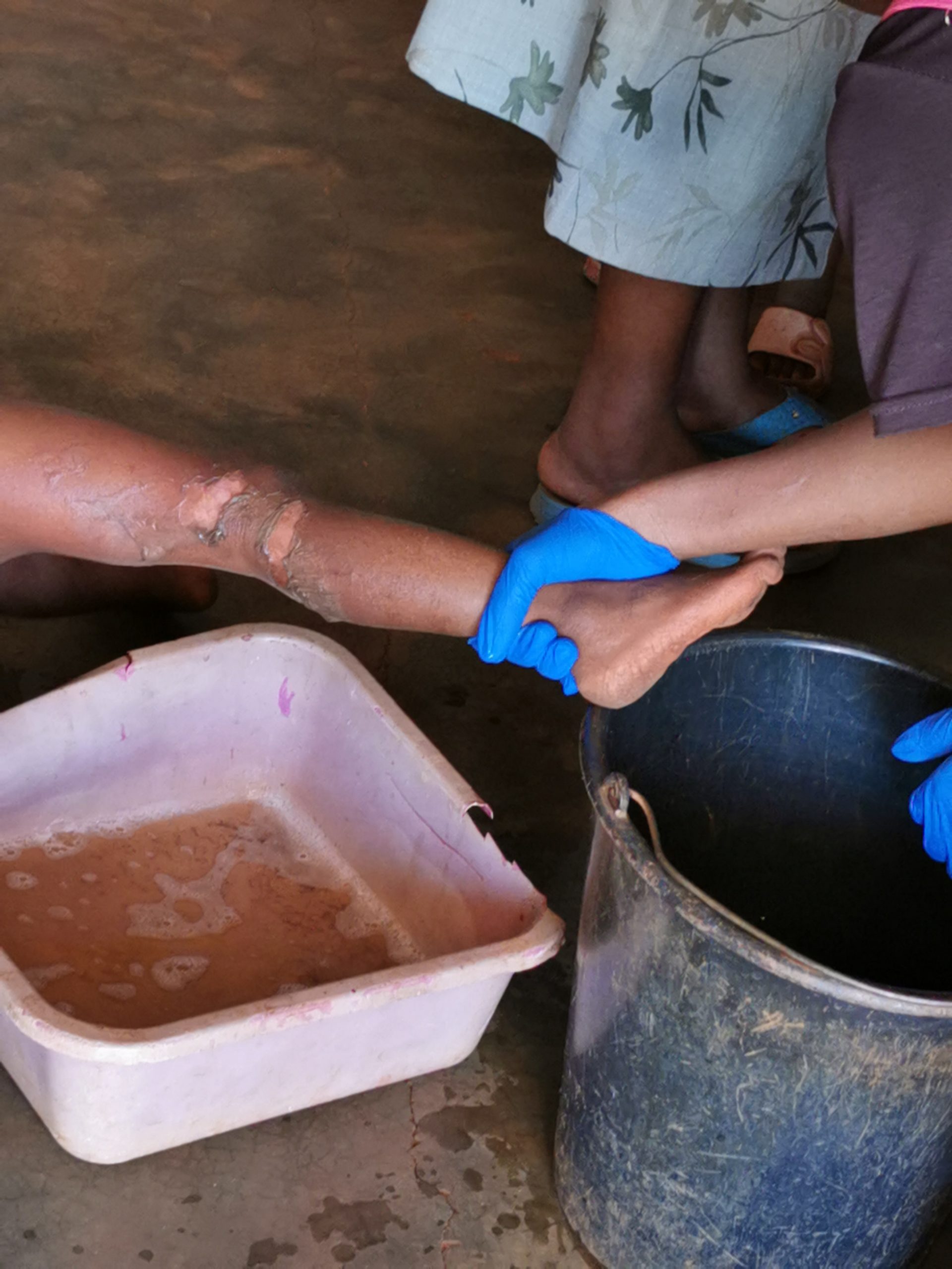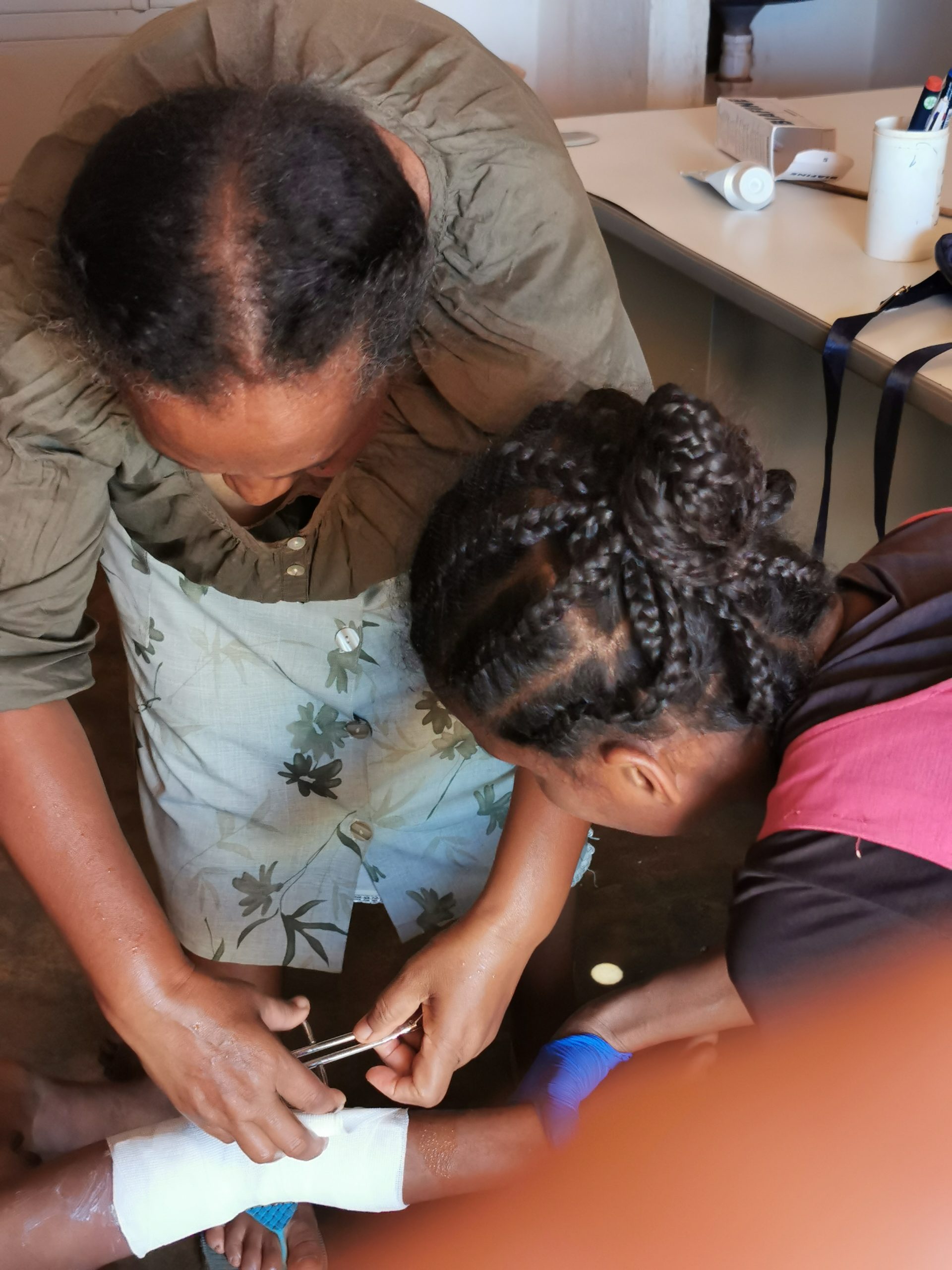 Ihre Kinder müssen – besonders in den Schulferien – unbeaufsichtigt in Ambohitsara bleiben. Das älteste Kind hat wohl Essen gekocht. Die anderen haben gespielt. Dabei ist der kleinste Junge dem Kochtopf zu nahe gekommen und hat sich daran verbrannt. Da aber alle von dem 1-Euro-Projekt wissen, hat die Schwester schnell ihren Bruder genommen und ist ins Krankenhaus gerannt. Dort wurde er medizinisch versorgt und als er am nächsten Tag mit seiner Mutter zum Verbandswechsel kam, sah es schon sehr gut aus. Sie haben nur 1 Tasse Reis bezahlt….