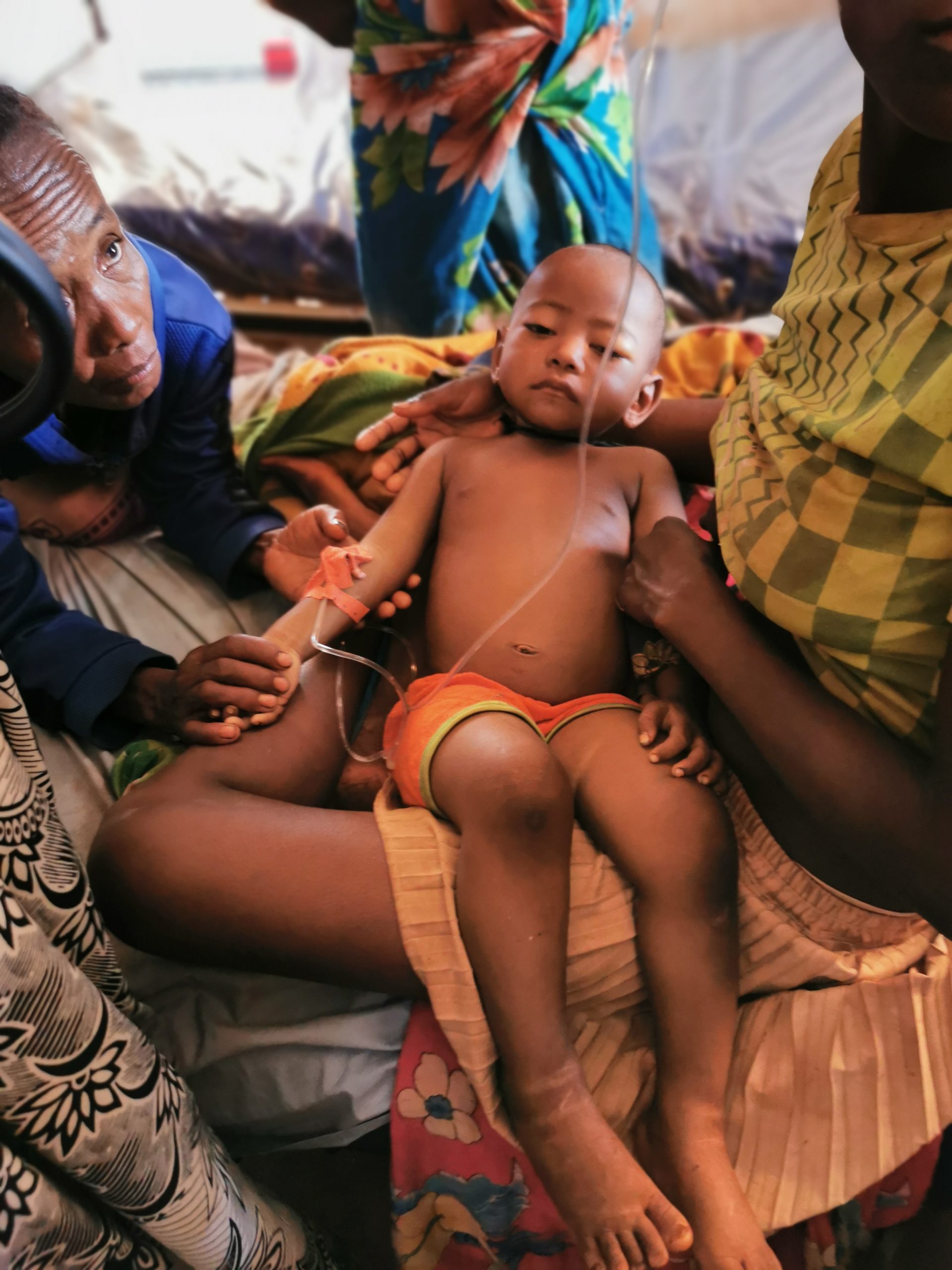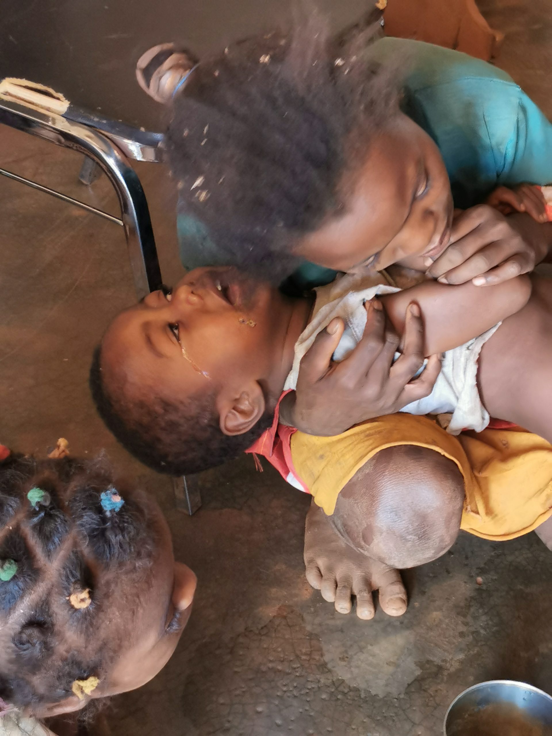 Auch das Kind ist in der Kategorie 1-Euro-Projekt. Die Eltern hätten niemals alle diese Medikamente bezahlen können, die wir ihm gegeben haben. So hat es – wie alle anderen – nur eine Tasse Reis bezahlt. Und wurde als geheilt entlassen.