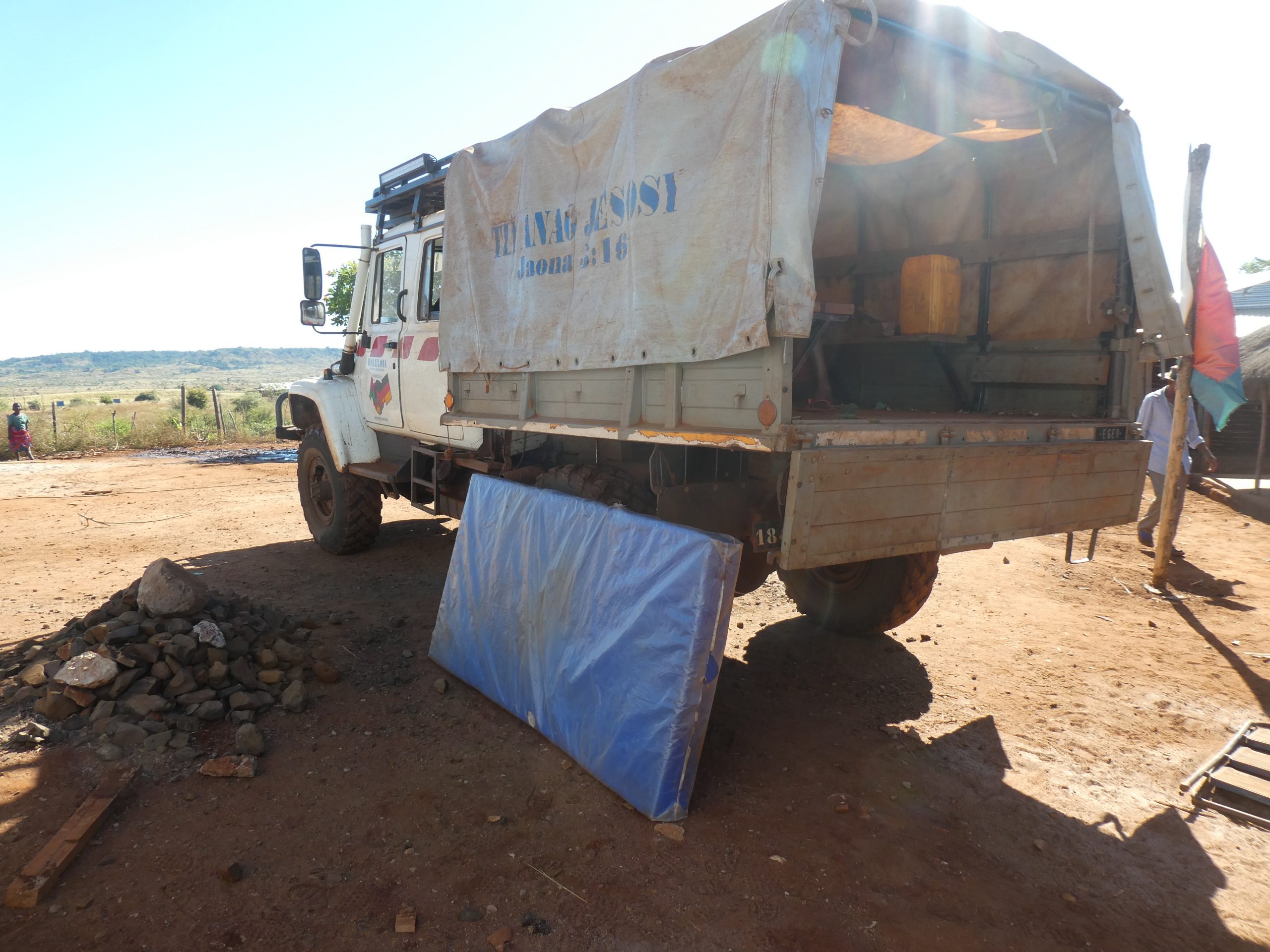 Durch das Rütteln wurde ich manchmal bei Evakuierungen sogar von der Sitzbank gefegt. Diese Zugkräfte haben jetzt, nach ca. 3 Jahren Einsatz, die Halterung der Abdeckplane hinten und auch die Plane selbst „erledigt“. Ohne die Plane ist es in der Regenzeit unzumutbar, jemanden liegend hinten zu transportieren.
