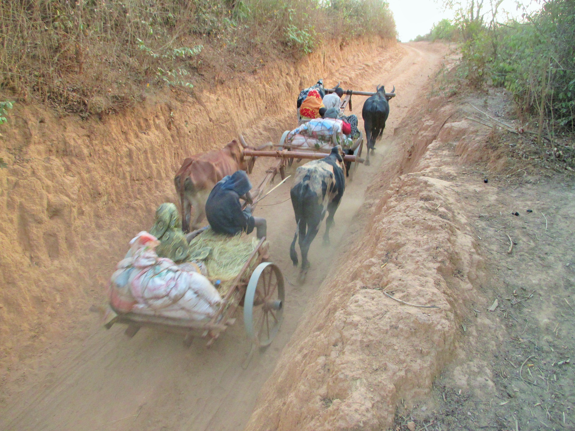 Unser Einsatzteam ist jetzt doch schon am Mittwoch um 1 Uhr mittags losgefahren. Debora schreibt, es war überraschend kalt (!!) unterwegs und hat auch geregnet. Normalerweise regnet es nie in der Trockenzeit. Das ist absolut unüblich. Und wenn es dann auch noch kalt ist – das sind sehr unangenehme Reisebedingungen, da diese Ochsenkarren ja kein Dach haben. Es zieht auch ziemlich da oben auf der Karre.