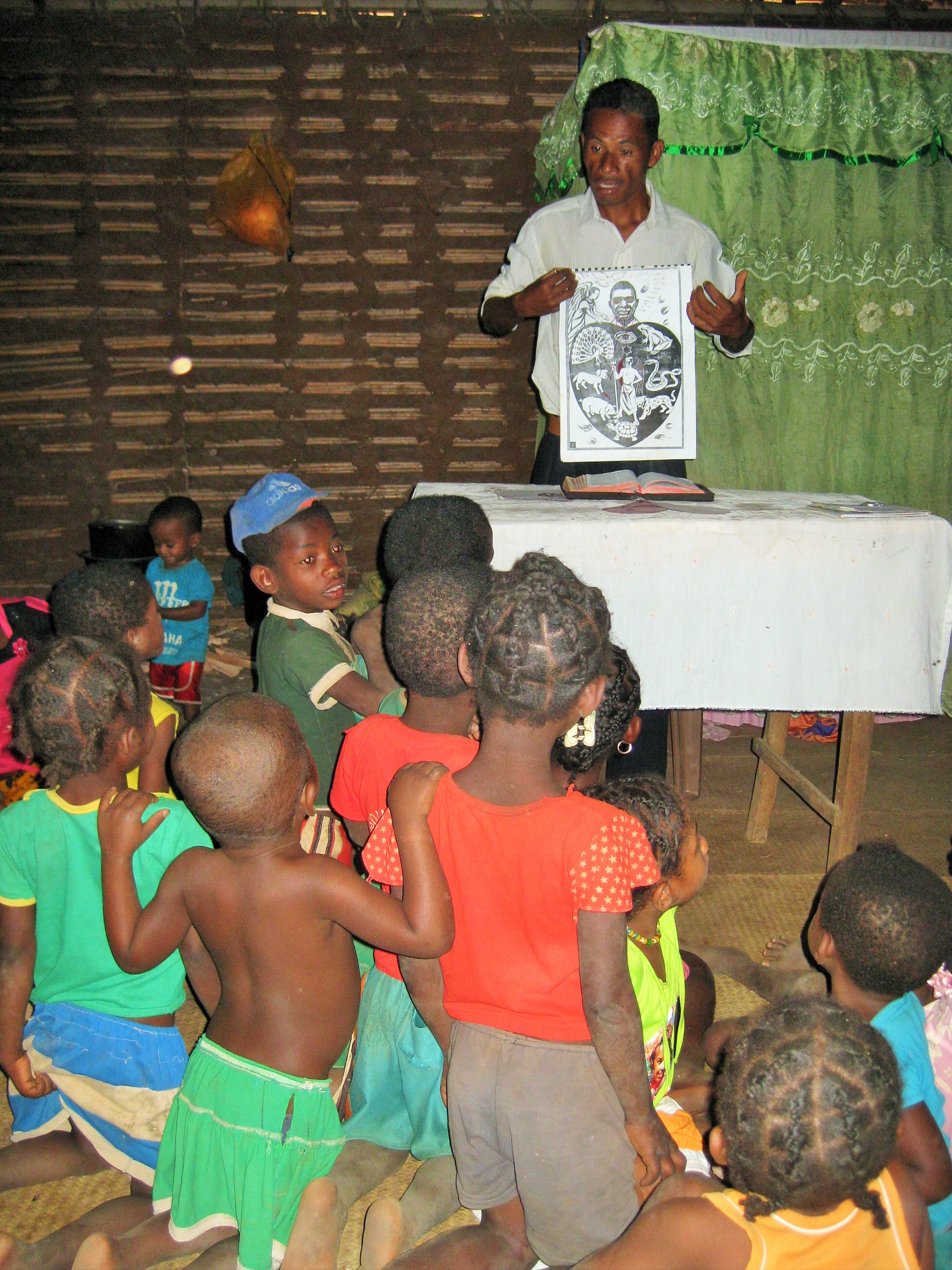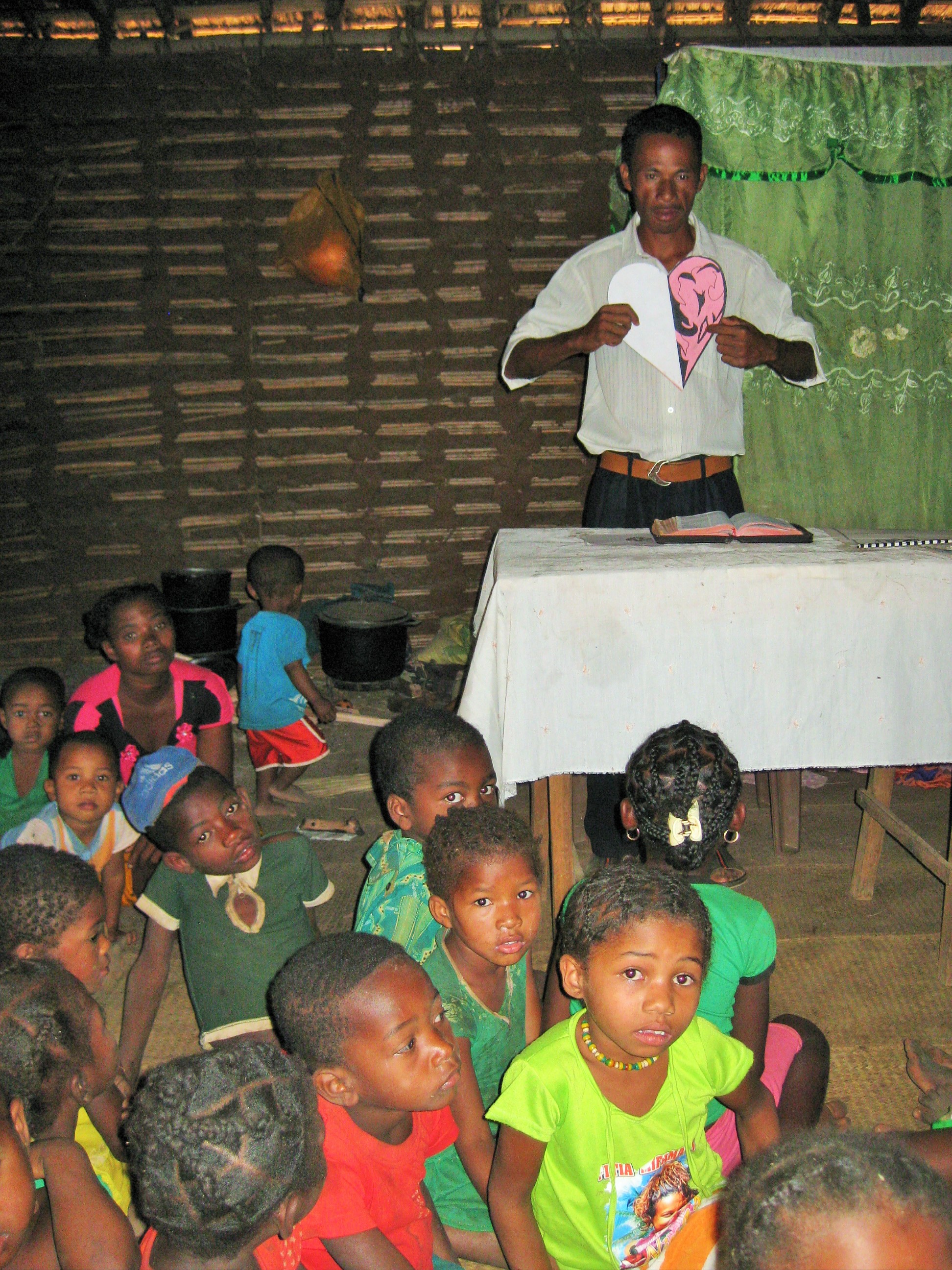 Debora hat erzählt, sie haben sich mit 5 Frauen und einigen Kindern das Buch und die Bilder „das Herz des Menschen“ angesehen und es erklärt. Das ist eins der gängigen Evangelisationsmaterialien, die die Evangelisten immer dabeihaben. Da wird beschrieben, wie das Herz (also das „Innerste“, das Zentrum) des Menschen aussieht, wenn er Jesus hat (froh, hell, positiv, glücklich…) oder wenn der Mensch mit Jesus nichts „am Hut“ hat (traurig, dunkel, negativ, unglücklich…). Debora hat die Aktion als „ziemlich interessant“ beschrieben.