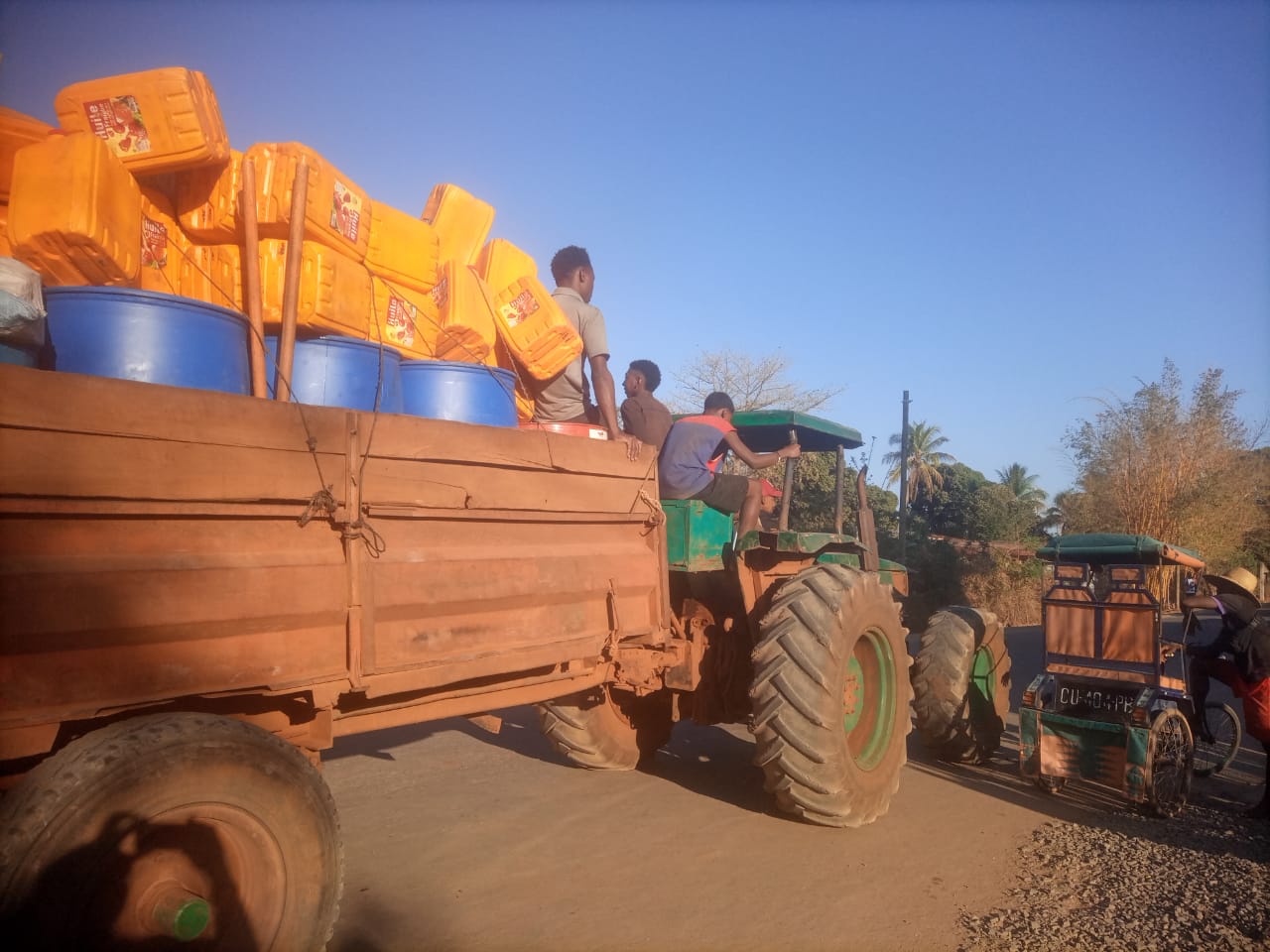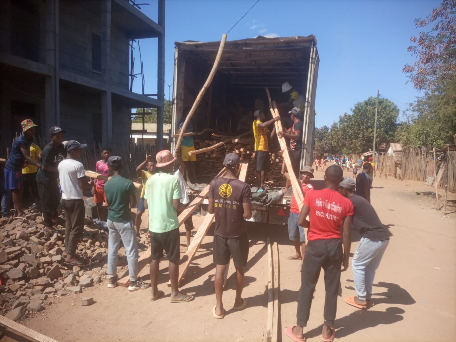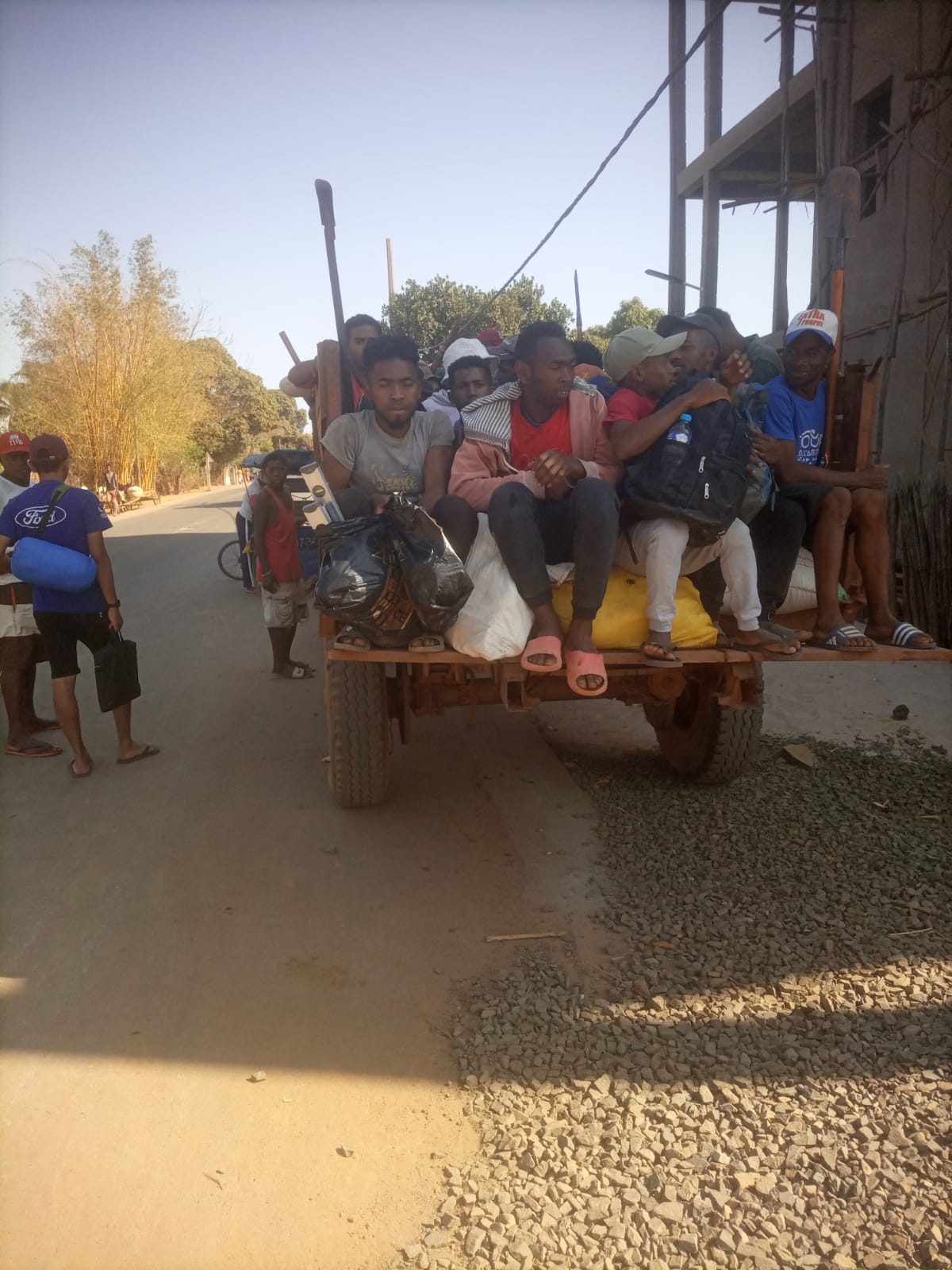 Zuerst wurden alle Baumaterialien und Bauarbeiter aus der Hauptstadt nach Port-Berger zu unserem Stützpunkt bei Benjamins Mutter und zu der Mehrzweck-Unterkunft (Lerncamp usw.) gebracht. Von dort aus wurde alles verladen und es ging nach Ambohitsara.