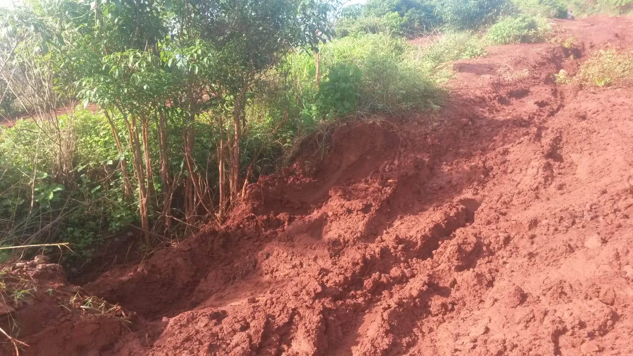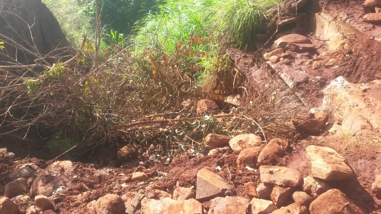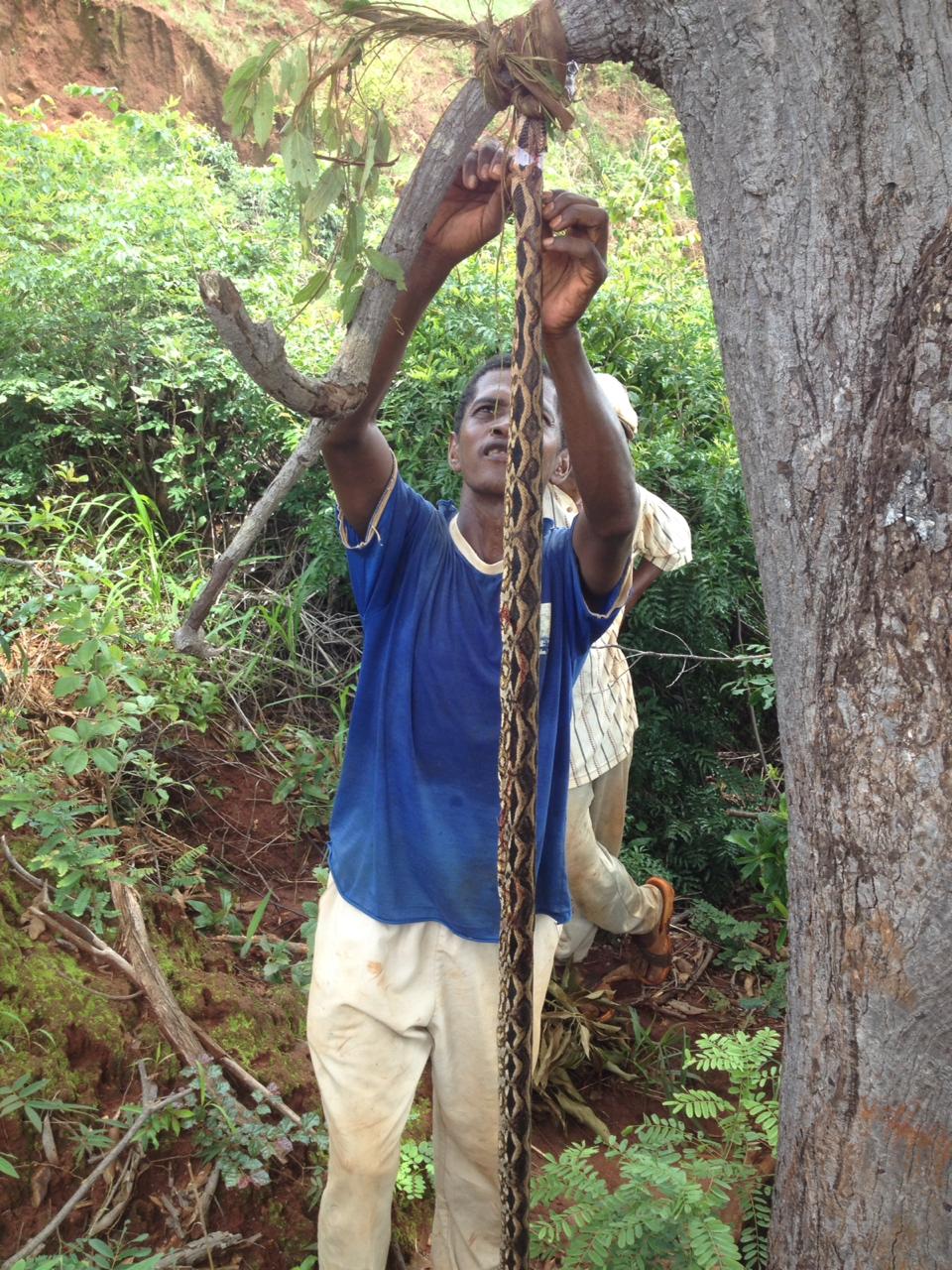 Ein Erdrutsch hat diese „Straße“ erst kürzlich noch enger gemacht. Und es hat ständig geregnet (was ja für den Ackerbau sehr gut ist). Normalerweise darf das Auto nicht fahren, sobald es anfängt zu regnen. Man muss warten bis der Regen wieder aufgehört hat und dann noch 1 Stunde, bis das Wasser abgelaufen und die Piste nicht mehr so rutschig ist. Als der Sadko letzte Woche von Port-Berger rauf nach Ambohitsara wollte, hat es auf dem Weg zur ersten Steigung angefangen zu regnen. Sie haben sich entschieden, nicht umzukehren sondern weiter zu fahren. Das Auto ist er dermaßen gerutscht, dass es mit 1 Rad über dem Abgrund hing. Die Stelle war so ungünstig, da war auch unsere Seilwinde nutzlos. Außerdem war diese Stelle eng durch die Reste der alten B18. Und es gab noch dazu eine Schrägneigung der Straße in Richtung Abgrund.