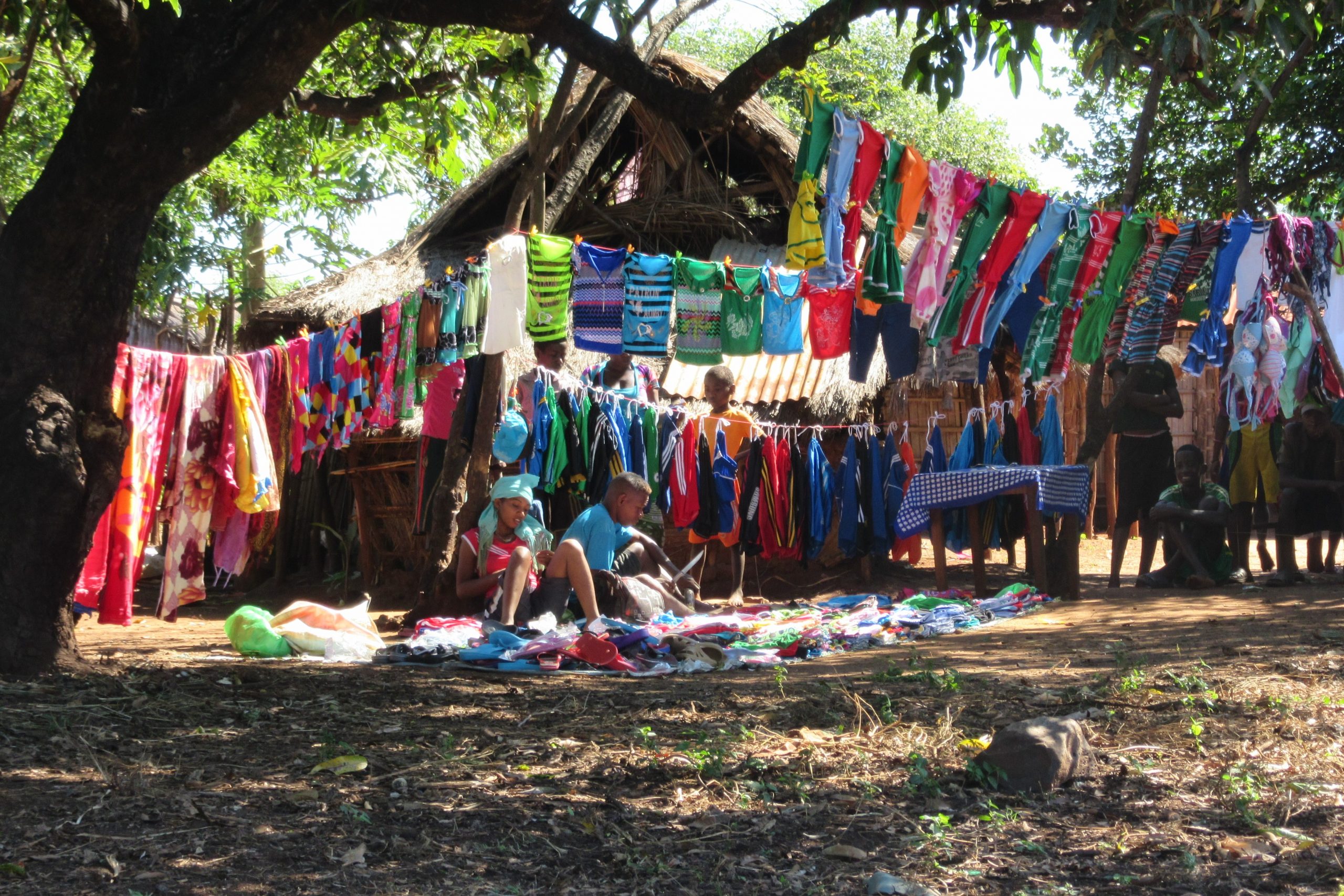 - Bazar im Dorf wo u.a. Schneiderarbeiten verkauft werden