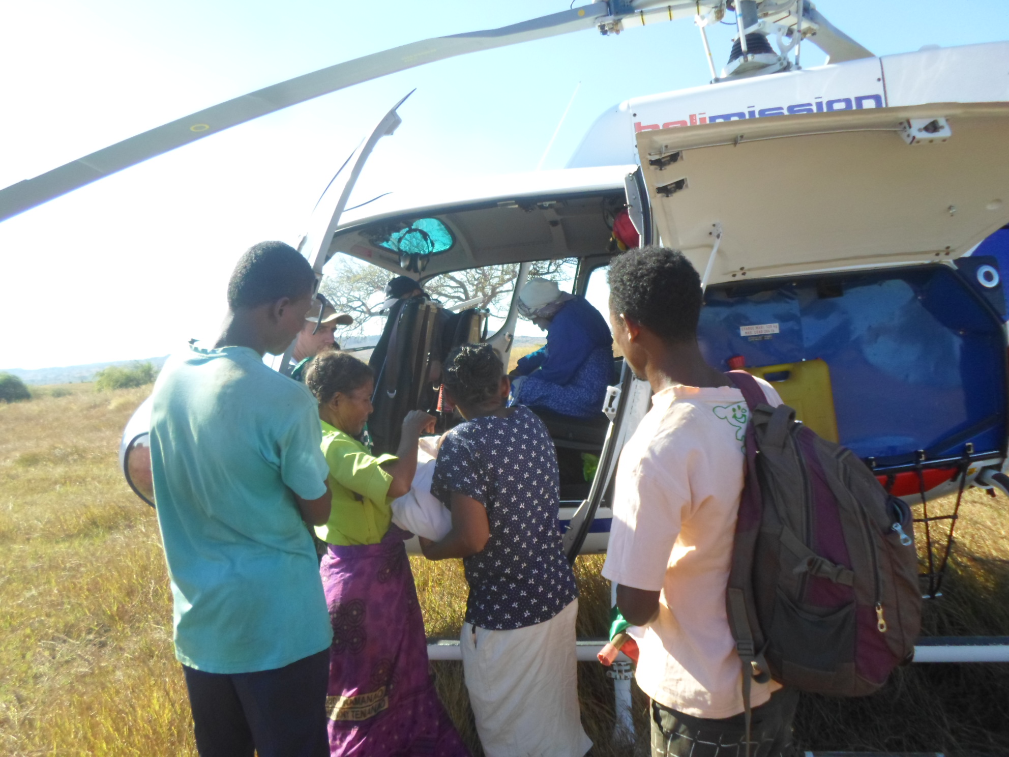 Nach einigen Tagen wurde die Situation des kleinen Ruffin kritisch, es drohte (bei dem Staub) eine Hirnhautentzündung. Wir haben gebetet. Und Gott hat Wunder getan. Zuerst haben wir Heli-Mission kontaktiert. Das ist eine Organisation aus der Schweiz, die an vielen Orten der Welt, und auch in Tana ansässig ist. Sie fliegen Menschen, Vorräte medizinische Ausrüstungen und Medikamente an Orten, die per Auto schlecht zu erreichen sind. Heli Mission hat sofort alle Flugpläne gestrichen und uns erklärt, dass sie startklar wären, um Ruffin abzuholen.