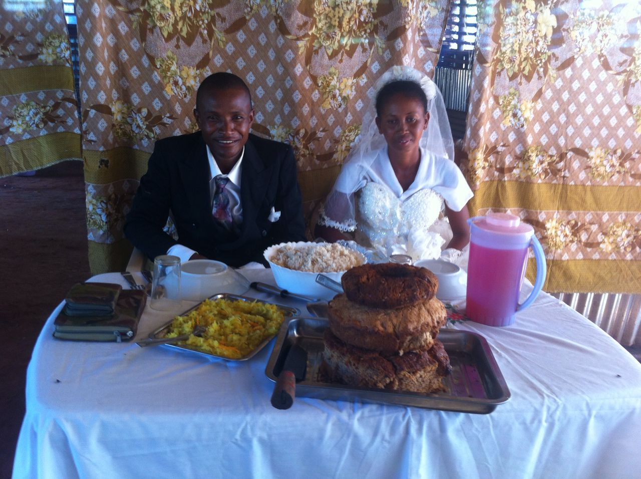 Bei „unserem“ Brautpaar war das nicht so. Es handelt sich hier um unseren früheren, langjährigen Mitarbeiter Tiankavana, dem jüngeren Bruder unseres Stipendiaten Clement. Er hat bis 2014 bei Hope-Projekt-Madagaskar gearbeitet und war sozusagen die inoffizielle „rechte Hand“ unseres Projekt-Direktors Anatole, weil er sehr zuverlässig ist – solche Leute findet man nicht so oft. Offiziell war er im Ackerbau-Team und vor allem für die Zugochsen und Versorgungsfahrten nach Port-Berger zuständig. Jetzt arbeitet er als selbständiger Unternehmer und handelt mit Waren, die er in der Hauptstadt verkauft. Seine Frau heißt Dicte und kommt aus der Nähe von Antsohihy.