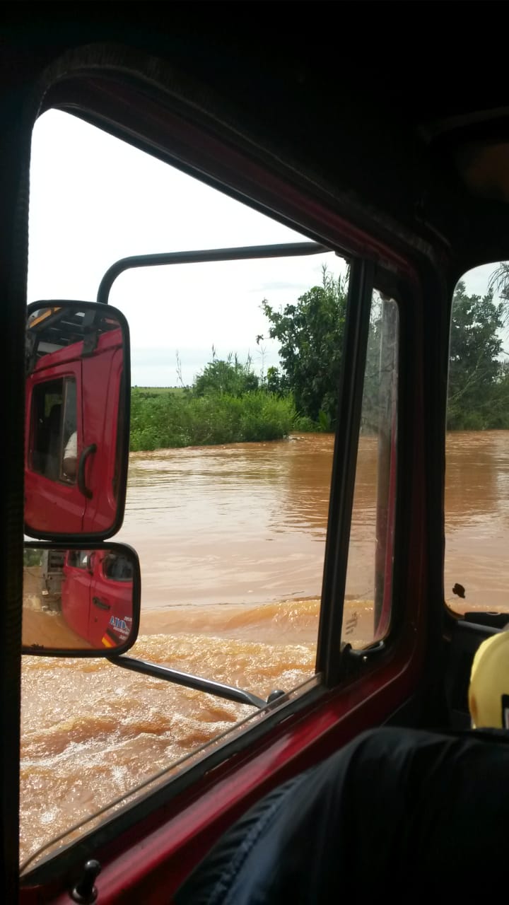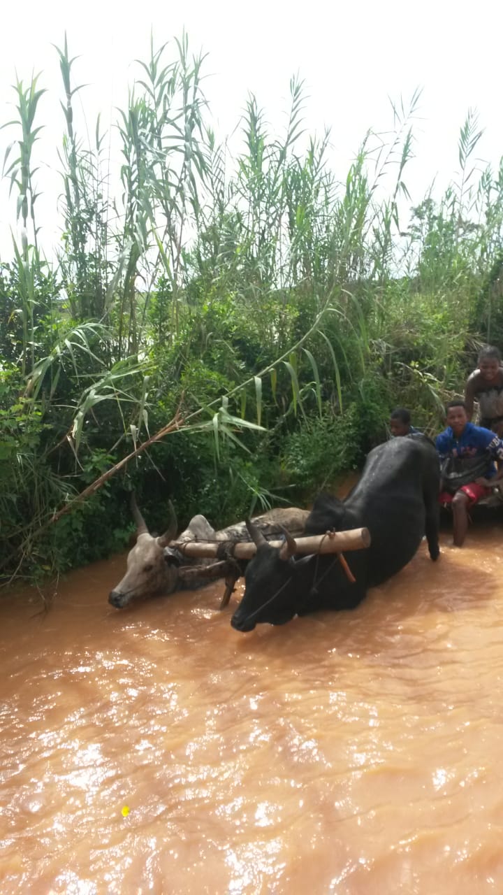 Genauso auf der Rückreise. Pastor Tovo und Justine mussten zurück nach Majunga ( ca. 400km entfernt von p/b an der Westküste), Clement wollte nach Hause, ca. 200km nördlich von p/b und Viviane & Roseline sollten nach Tana fahren (ca. 600km von dort nach Süden). Es gibt da einen Fluss, 30 Minuten von Port-Berger entfernt. Der trennt die „Zivilisation vom Busch“. Ab diesem Fluss stand quasi alles unter Wasser. Auf den Bildern unten sieht man Menschen, die versuchen den Fluss zu Fuß oder per Ochsenkarre zu überqueren. Was für eine Gnade, dass wir den SADKO haben…. Und sogar der muss manchmal stundenlang warten.