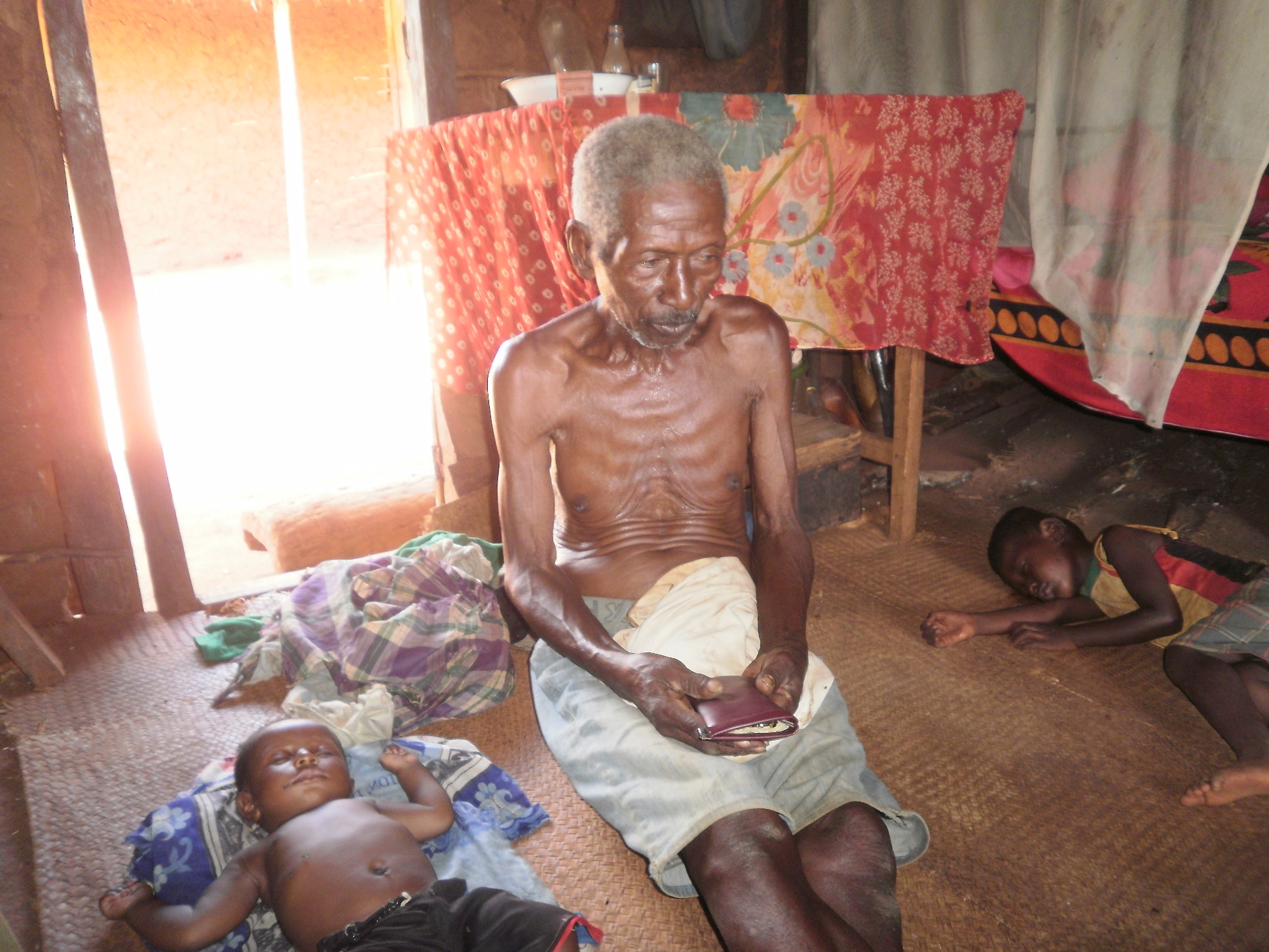 - Dorfältester in seiner Hütte mit Enkelkinder