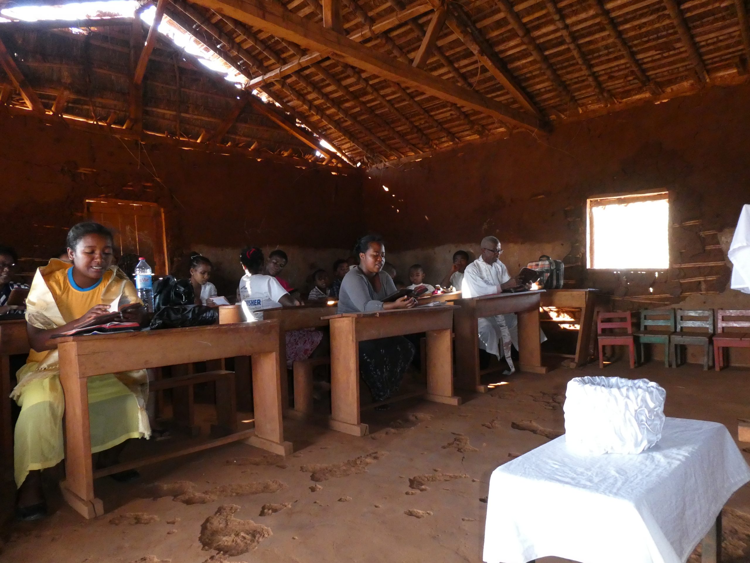 Unsere Evangelisten führen in der ganzen Gegend die Erwachsenen-Bildung durch. Das machen gerade die Evangelisten, weil sie die Fähigkeit haben, die Leute dort abzuholen, wo sie sind. Sie haben durch ihre Ausbildung auch eine außergewöhnliche Flexibilität. Außerdem sind sie „brennend für Jesus“. Als wir die Leseklassen gestartet haben, hatten wir die Wahl (so ist das System in Madagaskar), entweder normale „Lesebücher“ oder die Bibel als Lese-Lern-Buch zu wählen.