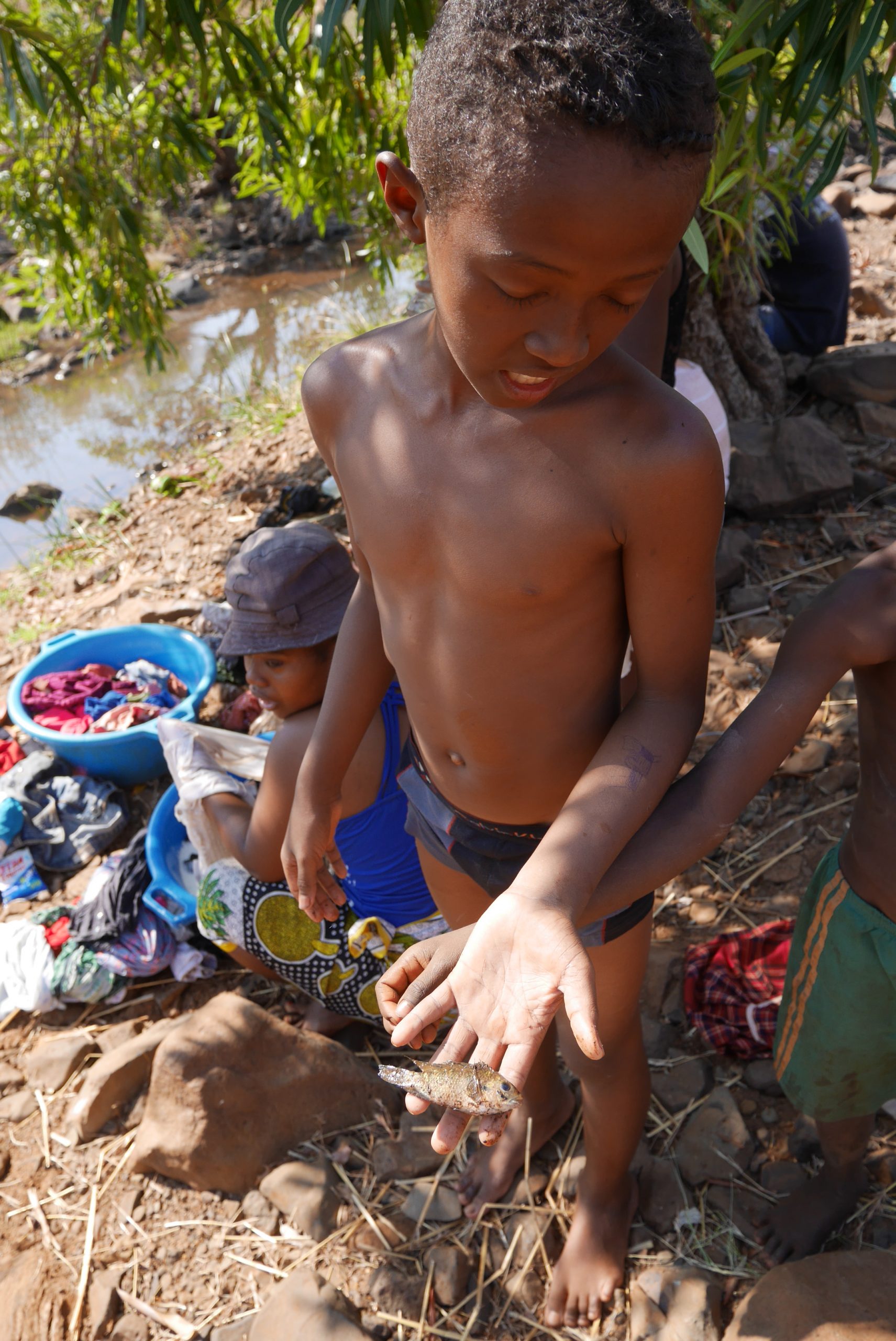 Anfangs ist das noch ein „wildes“, freies Leben für die Kinder. Sie spielen den ganzen Tag – mit selbst gebastelten Spielsachen, z.B. Fußbällen aus Plastiktüten oder Figuren aus Lehm. Oder miteinander, indem zwei die Ochsen spielen und der dritte den Ochsenkarren-Fahrer. Sie gehen auch in den Wald und „jagen“ kleine Vögel oder Fische, die sie dann über einem Feuerchen braten und essen.