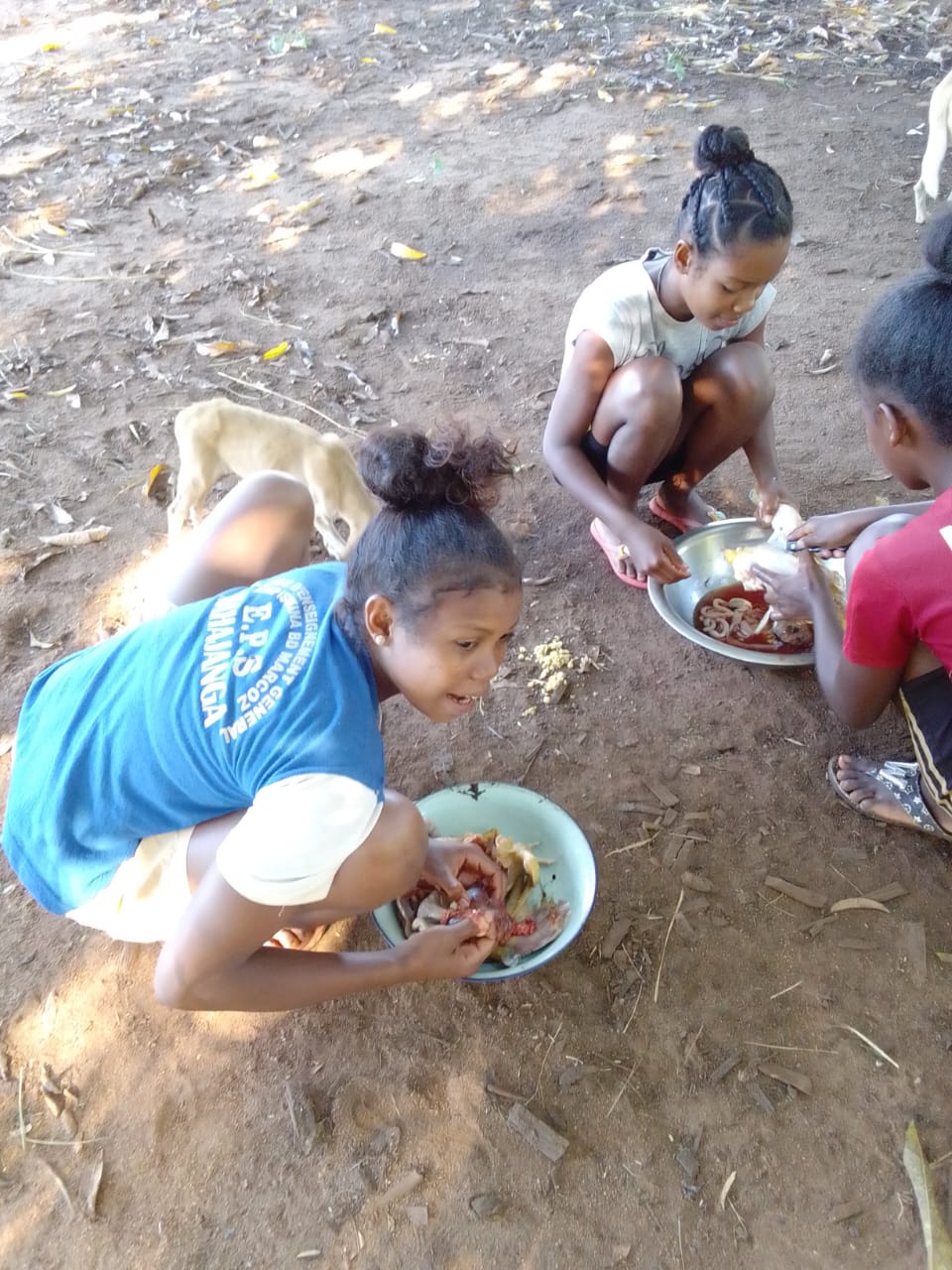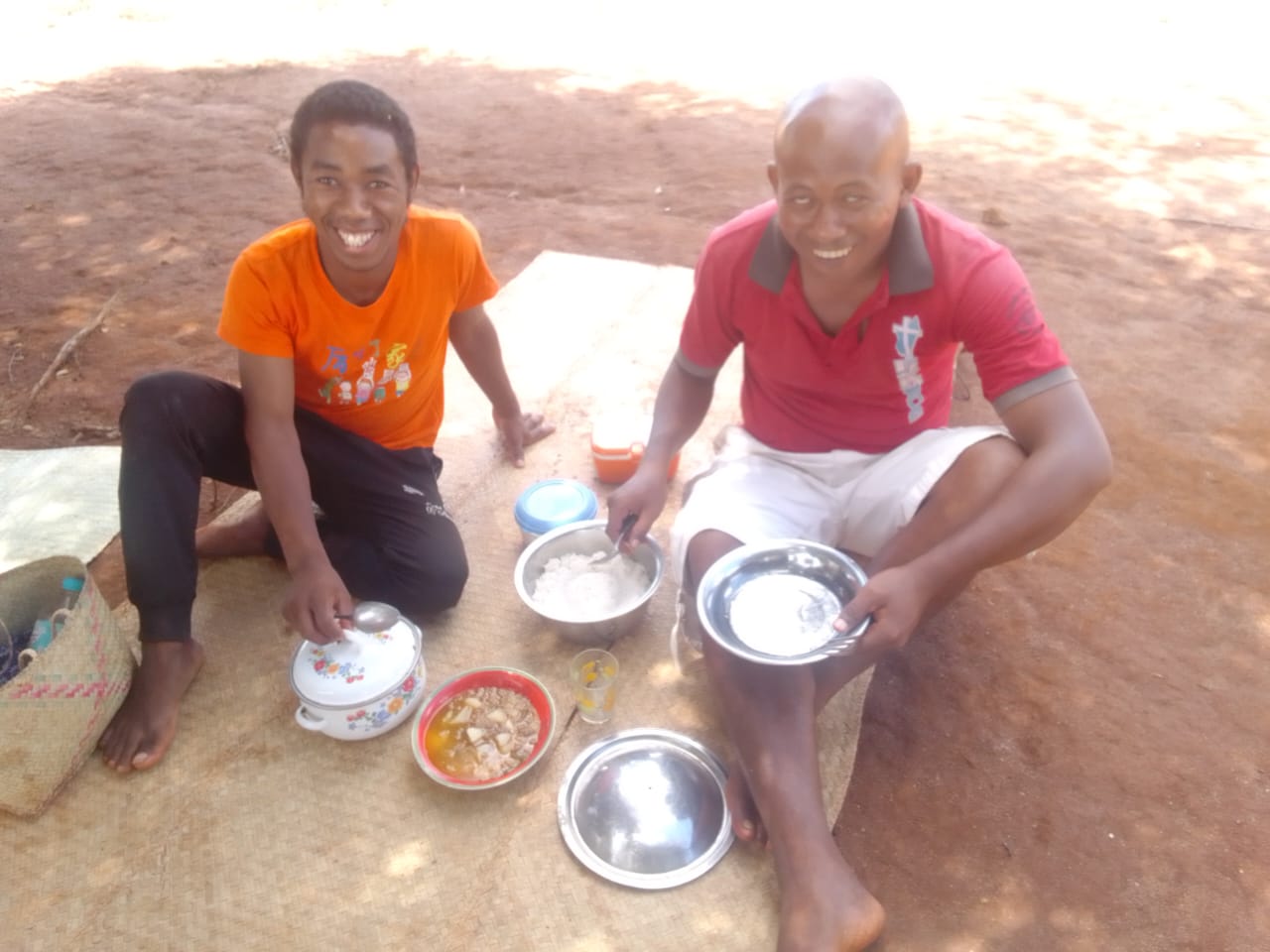 Unsere Vorgehensweise ist immer ähnlich, weil sie sich bewährt hat. Es gibt evangelistische Musikvideos, (meist auf ein Bettlaken oder ähnliches projiziert) zu denen dann das ganze Dorf tanzt. Einer unserer Evangelisten spricht und erklärt den Rettungsplan Gottes durch das, was Jesus für uns am Kreuz tat. Wir zeigen den Jesus Film, der in den lokalen Tsimihety-Dialekt übersetzt wurde. Anschließend kommt ein Bekehrungsaufruf, dem bis jetzt immer Menschen folgten. Halleluja! Bei solchen Zusammenkünften ist das ganze Dorf auf den Beinen und alle bleiben oft bis zum Morgengrauen wach. Es ist wirklich beeindruckend – ich war da auch schon des öfteren dabei… Auch gutes Essen fehlt natürlich bei solchen Festen nie!
