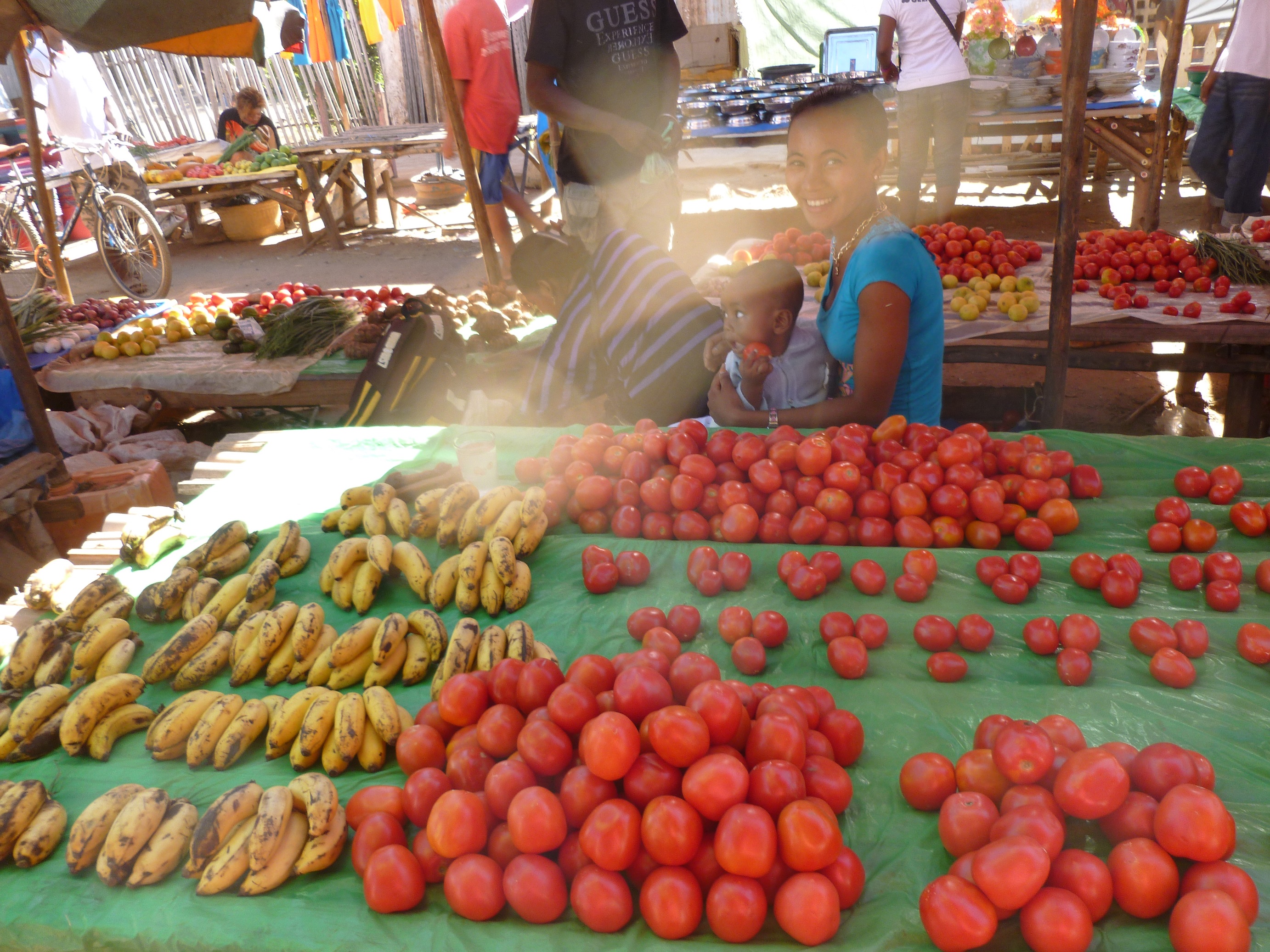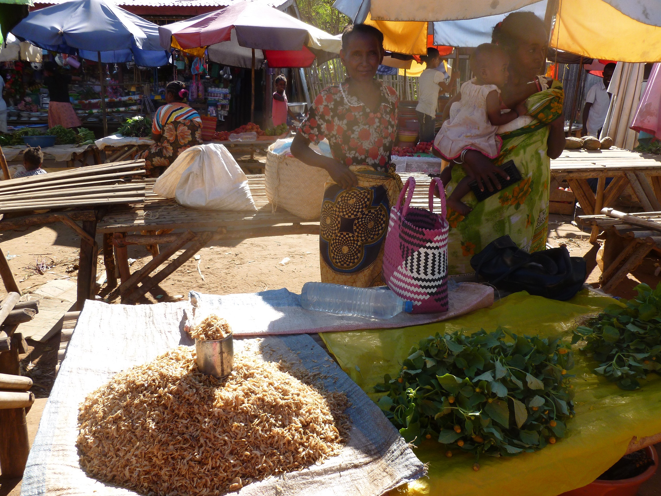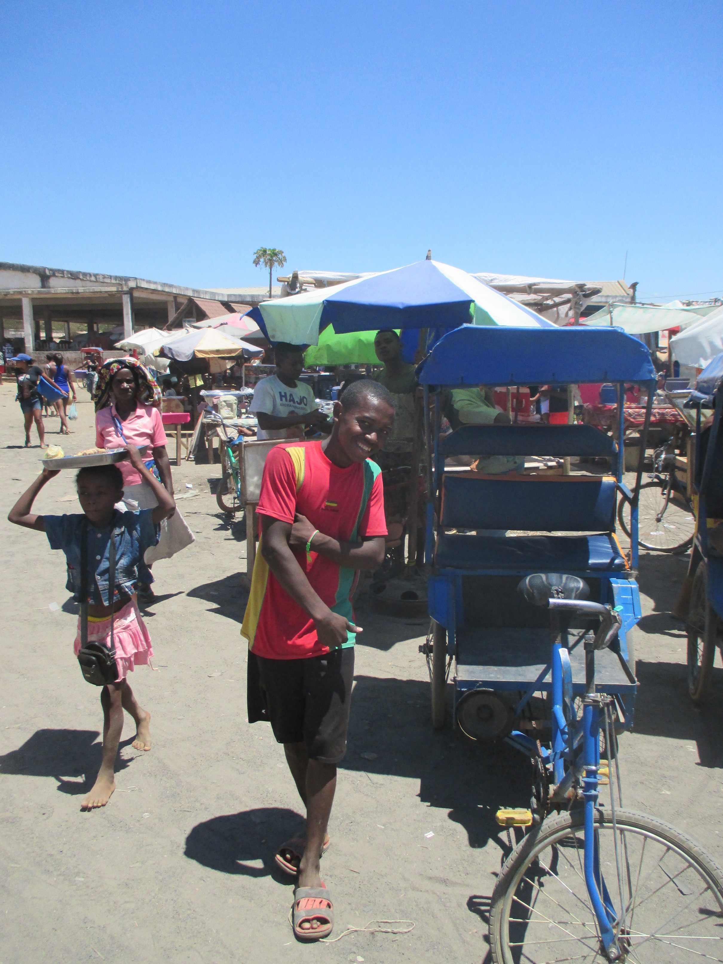 Schlendert man über so einen Markt, wird man gleich mit „Vazaha“ (Ausländer) angesprochen, und sie preisen einem ihre Waren an. Natürlich erst mal mit dem 4 bis 5 fachen Preis. Und dann muss man erst mal handeln. Das geht so: Sie nennen einen Preis, und ich mache einen Vorschlag (ein Bruchteil davon). Irgendwann treffen wir uns in der Mitte. Wenn sie dann die Hälfte des ursprünglichen Preises bekommen, ist das immer noch viel mehr als üblich. Oder man macht es so wie wir es i.d.R. machen. Ich suche mir was aus, und schick dann jemand aus meiner Verwandtschaft, der es für mich kauft. Kann natürlich auch passieren, dass er mich falsch versteht und dann irgendwas anderes kauft….