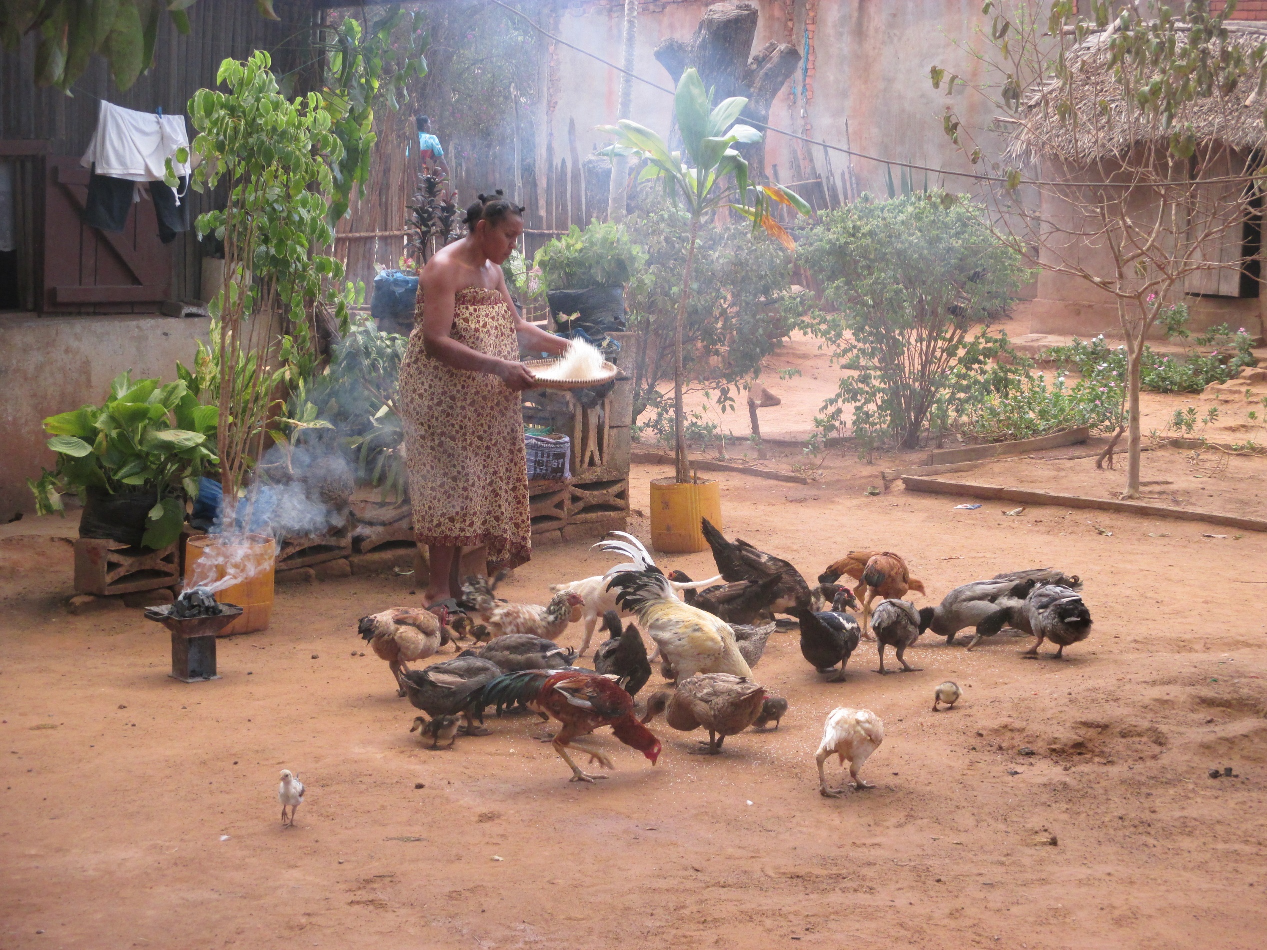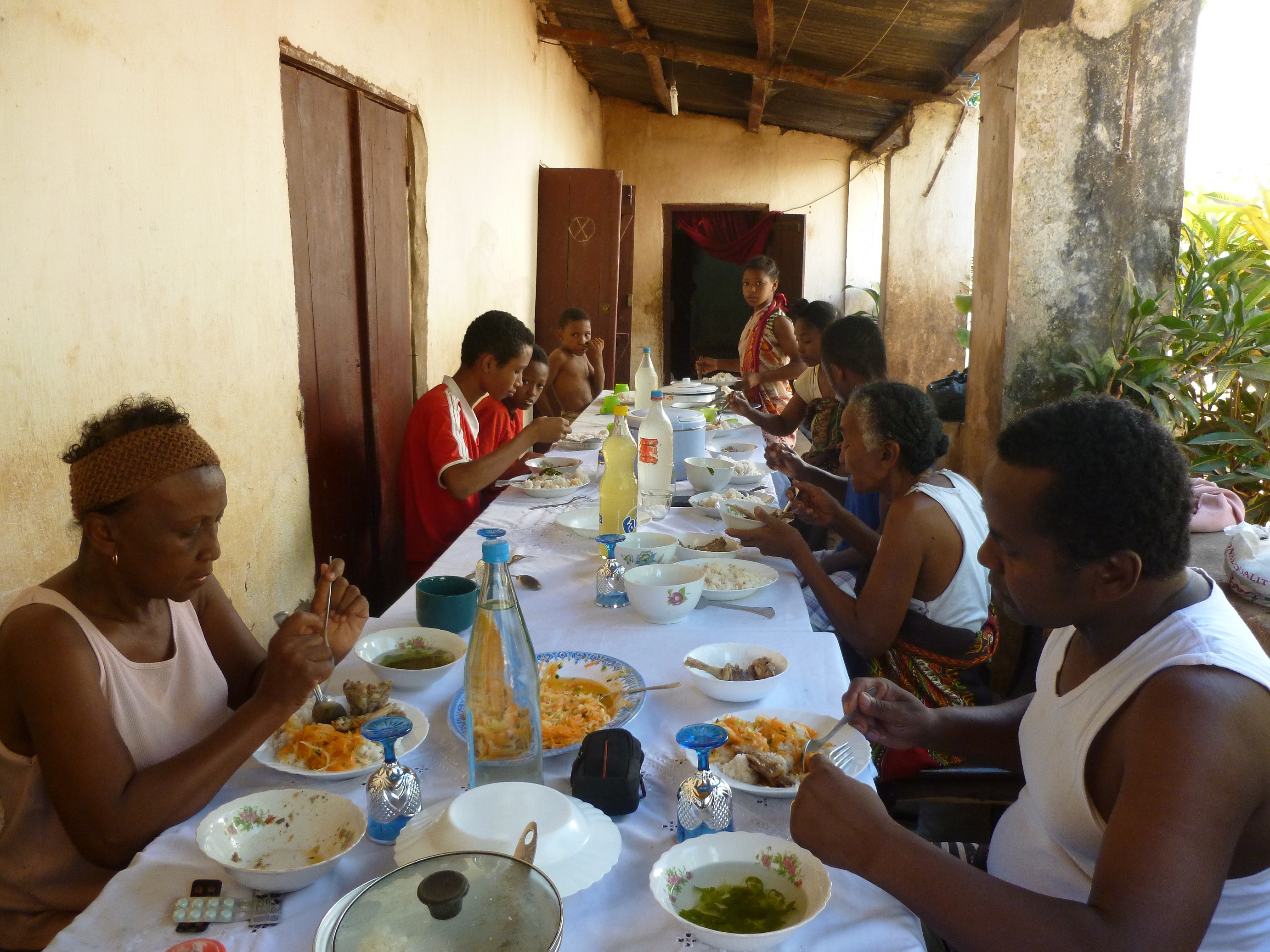 Dies ist eines der bemerkenswerten sozialen Netze in Madagaskar, die normalerweise auch greifen und nur in Ausnahmefällen (s. letzter Beitrag) nicht funktionieren. Esther lebt also auf dem Gelände meiner Schwiegermutter mit einigen anderen ihrer Schwestern, die auch von ihrem Ehemann verlassen wurden. Diese Frauen arbeiten (Lehrerin oder andere Tätigkeiten) in Port-Berger, sie wohnen und essen meist zusammen – aber jede hat auch ihren eigenen Bereich. Die Kinder spielen zusammen, machen gemeinsam Hausaufgaben und meine Schwiegermutter passt auf sie auf, während ihre Mütter in der Arbeit sind.