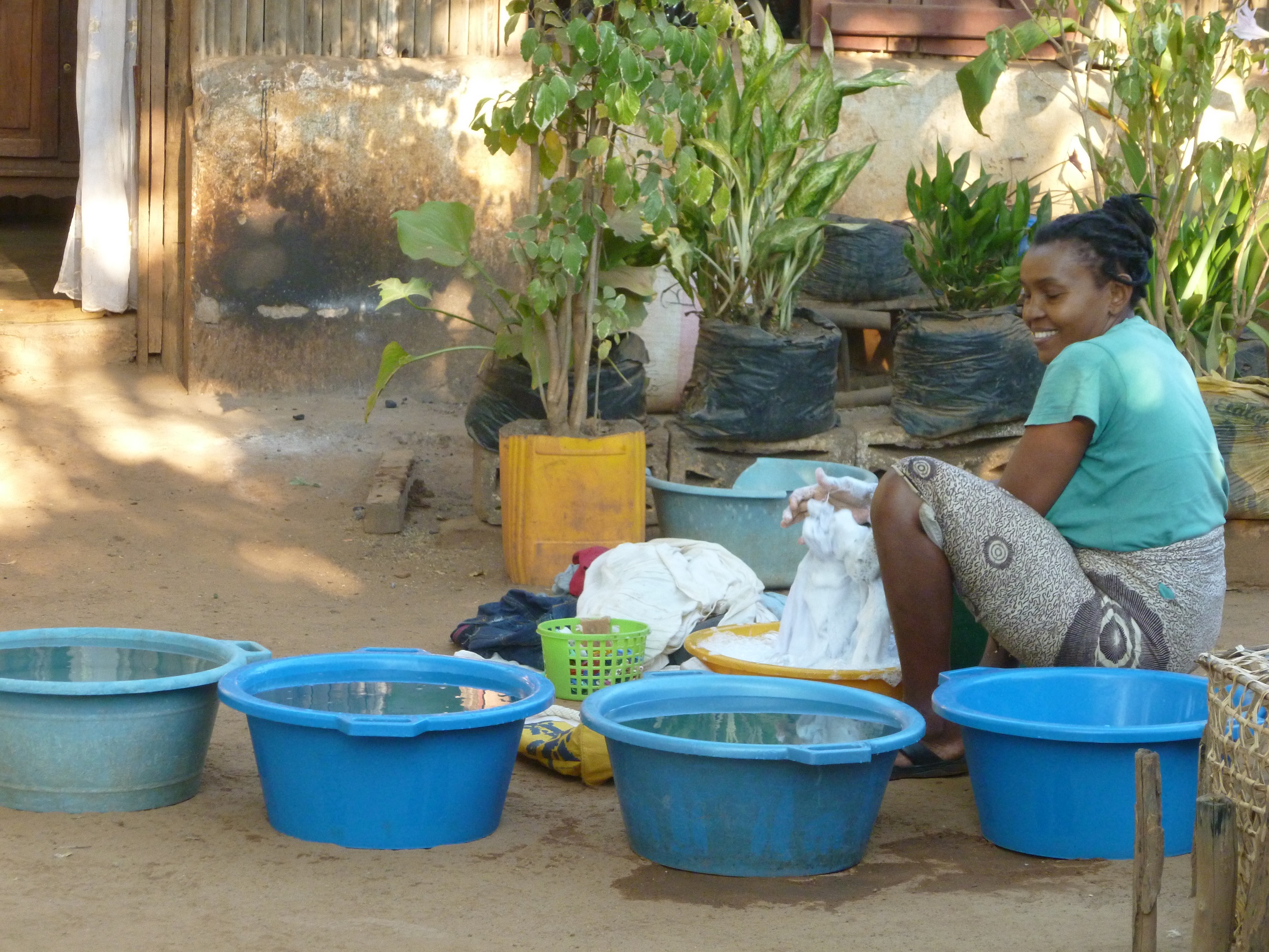 - Esther beim Wäschewaschen im Hof