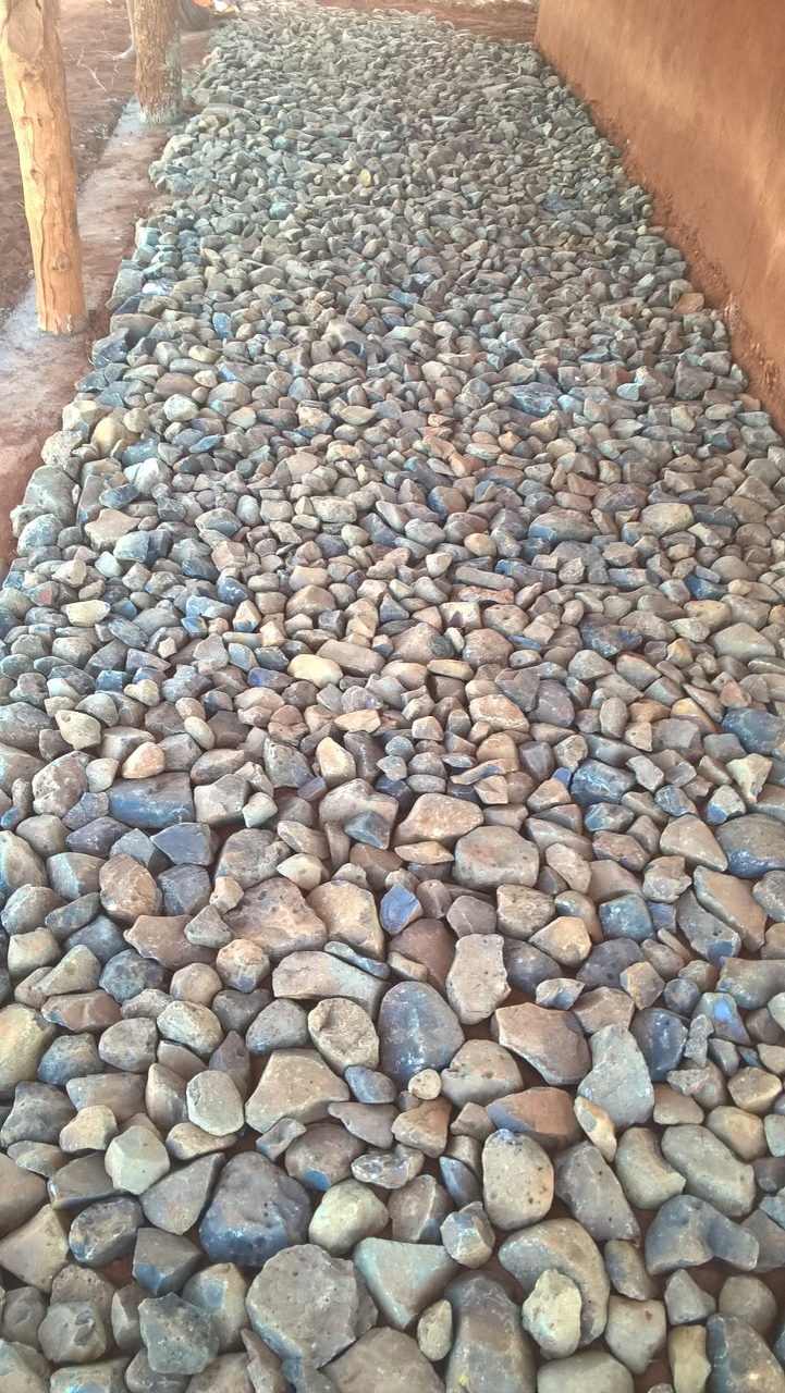 - Am Rand der Veranda, wo die Stützpfeiler stehen, eine Rinne graben und mit Steinen ausfüllen (Statik)