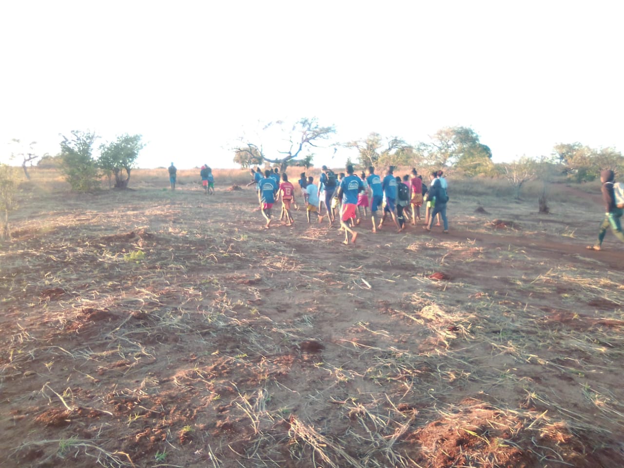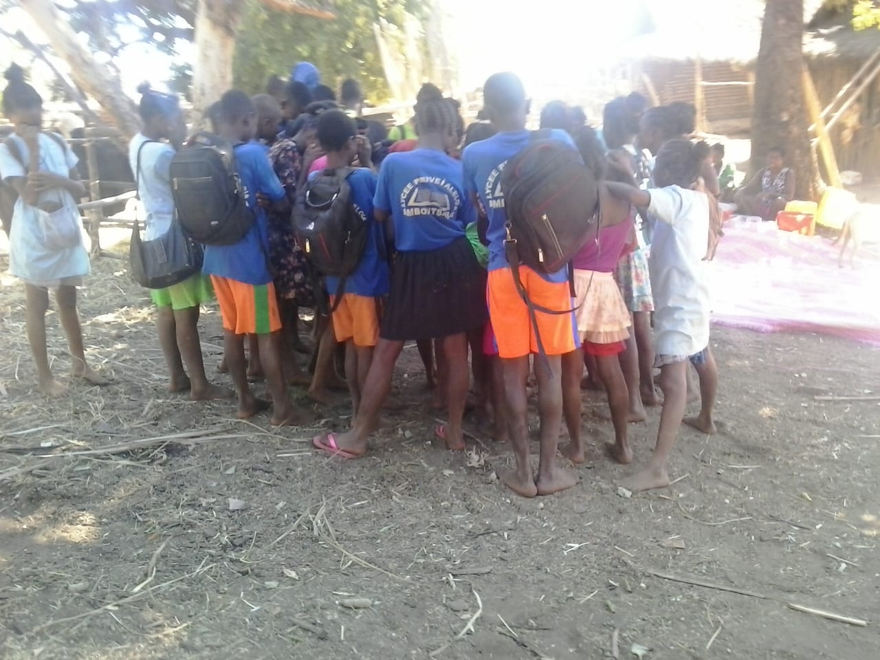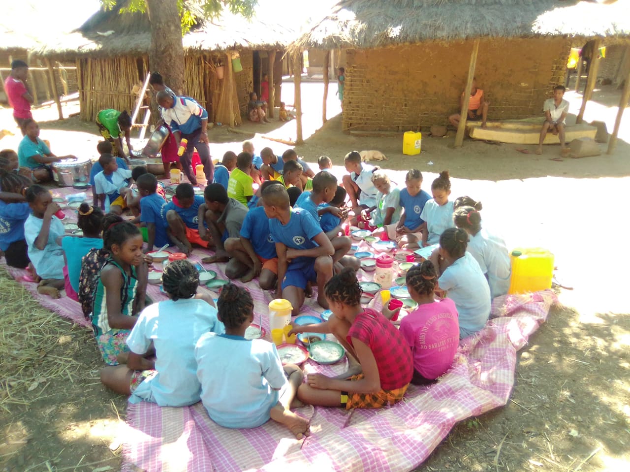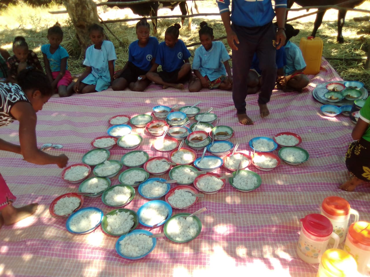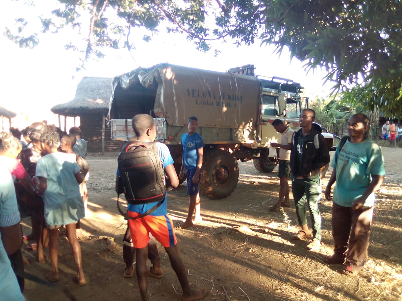 Für die Grundschüler ist es genau anders herum gelaufen. Sie mussten alle (zu Fuß) nach Andranomena laufen, um dort die Prüfung zu absolvieren. 1 Ochsenkarre mit den Kochutensilien samt Schulkantinen-Personal kam noch mit, weil die Kinder ja auch Hunger haben, mittags. Der SADKO hat zusätzlich noch im Laderaum Schulbänke transportiert – warum auch immer, anscheinend waren da vor Ort nicht genug vorhanden…..Es wurde vor der Prüfung gebetet, danach zusammen gegessen und anschließend sind alle wieder nach Hause gelaufen. Von den Bildern her war die Stimmung ziemlich entspannt…