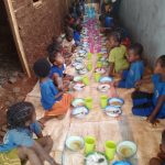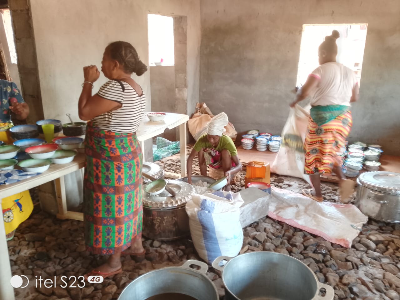 Vorläufig essen die Kinder jetzt in der noch nicht ganz fertiggestellten Nähwerkstatt! Und dort wird auch gekocht. Aber das ist keine Dauerlösung, sobald die Bauarbeiten weitergehen, müssen sie wieder „ausziehen“.
