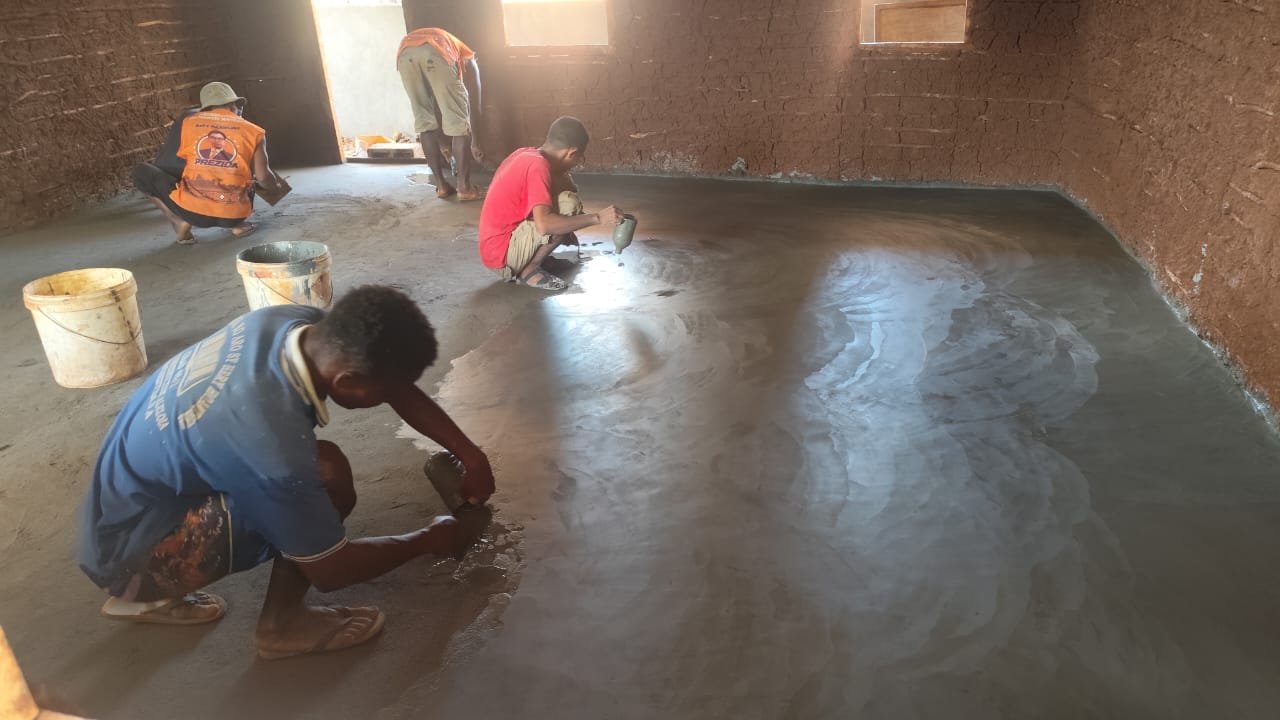 Der Boden der Nähwerkstatt ist inzwischen verlegt. Bei diesem Gebäude hatten wir einen langen Baustopp, weil der Handwerker einfach nicht kam. Er verschwand, nachdem er eine Teilzahlung (das Geld für die bisher geleistete Arbeit) erhalten hatte. Er wollte aber mehr. Da wir ihm keine Vorauszahlung für künftige Arbeitsleistungen geben wollten, sagte er einfach, er hätte jetzt keine Zeit und müsste erst mal anderweitige Aufträge annehmen…So ist das oft in Madagaskar. Wenn die Leute nicht wollen, dann kann man nichts machen, auch wenn man einen Vertrag mit ihnen gemacht hat. Auf dem Dorf sind Verträge oft „nicht ihr Papier wert“… Aber jetzt ist er – dank eurer Gebete – plötzlich „zur Stelle“.