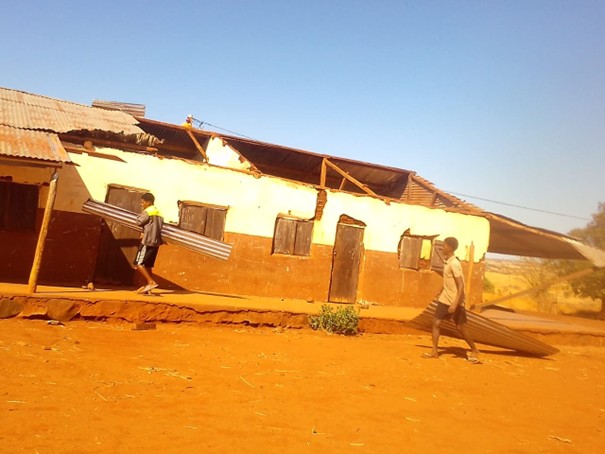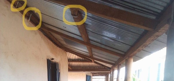 Innerhalb weniger Wochen wurden 2 unserer Gebäude von einer „lokalen Windhose“ zerstört – ein drittes ging letztes Jahr deswegen kaputt und konnte seitdem immer noch nicht wieder aufgebaut werden. Wenn man die Dächer solcher Gebäude nicht sofort repariert, dann werden auch die Wände durch den Starkregen der kommenden Regenzeit weggewaschen. Man kann das ganz deutlich an dem College-Gebäude unten im Bild sehen.