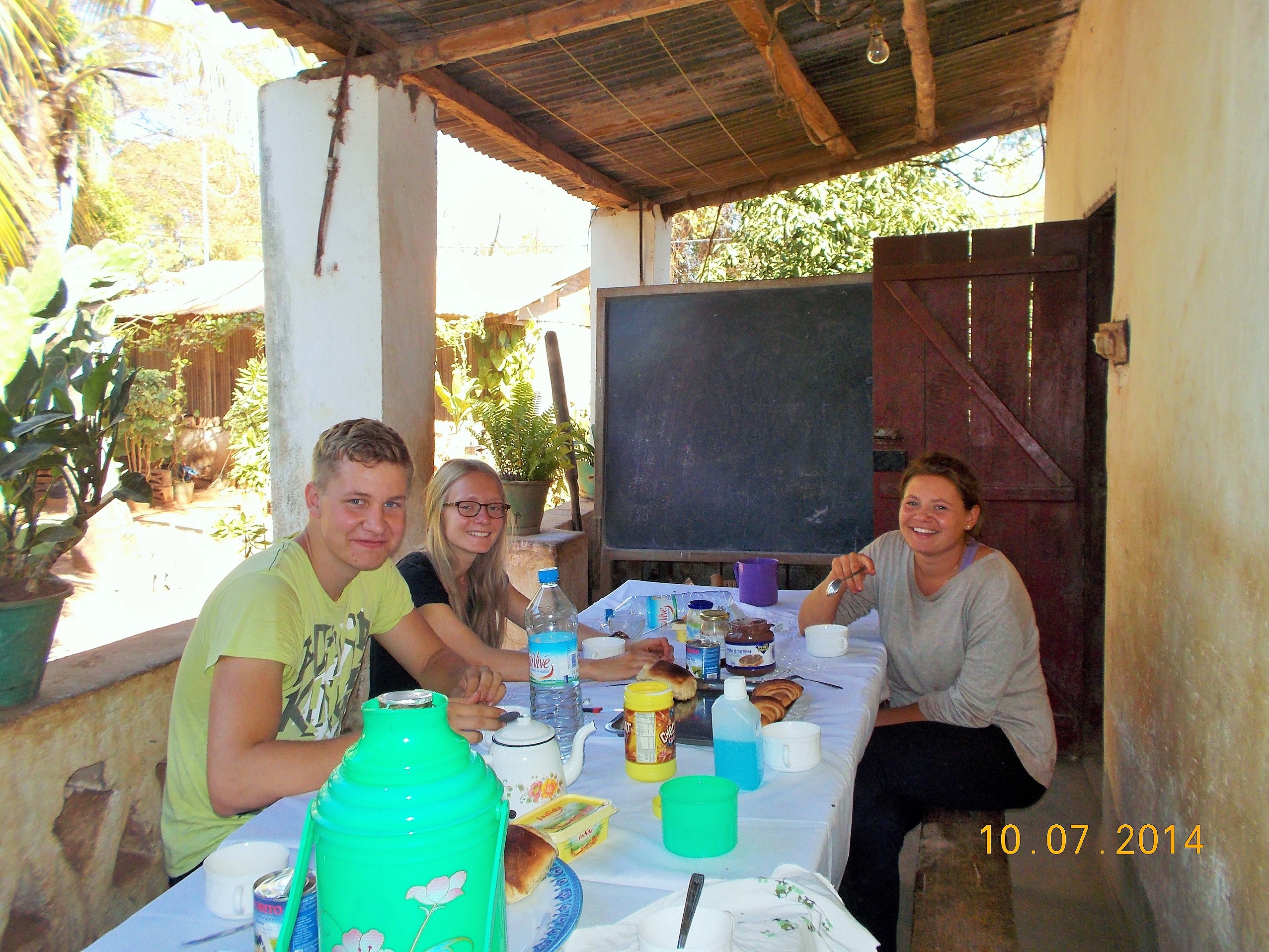 Unsere Truppe ist gestern gut in Port-Berger angekommen. Im Hof von „Oma“ (meiner Schwiegermutter) ist es wirklich sehr schön. Sie macht den Neuankömmlingen immer ein tolles Frühstück, mit den Sachen, von denen sie glaubt, dass die „Vazaha’s“ (Ausländer) sie mögen. Z.B. Croissants, Pain au chocolate und Baguettes aus der Bäckerei auf dem Markt von Port-Berger. Und Kaffee. Alles Sachen, die die Madagassen gewöhnlich nicht essen. Sie halten sich lieber an Reis mit Rührei oder Reis mit Fleisch/Fisch. Nicht so mein Fall, schon morgens zum Frühstück….