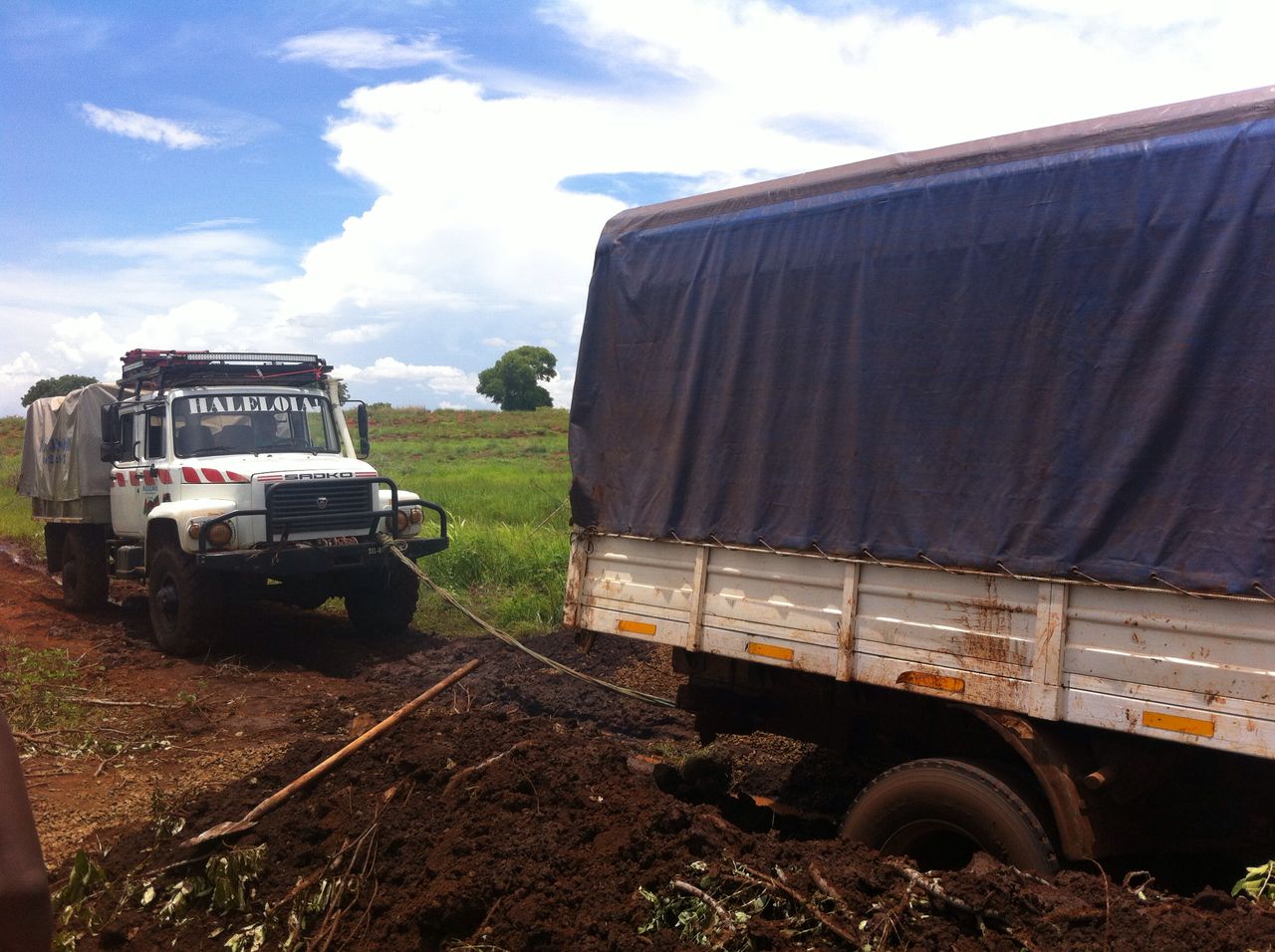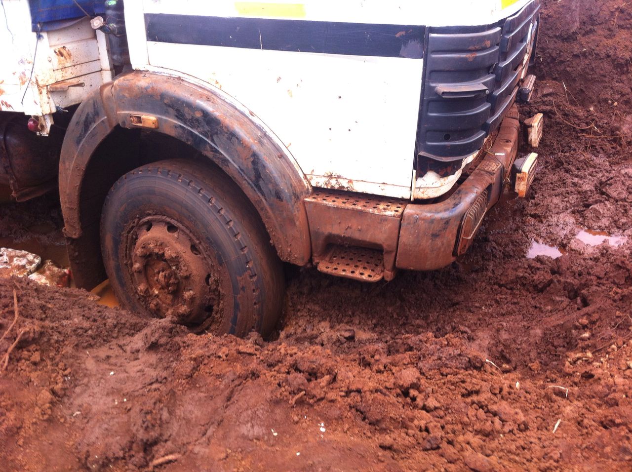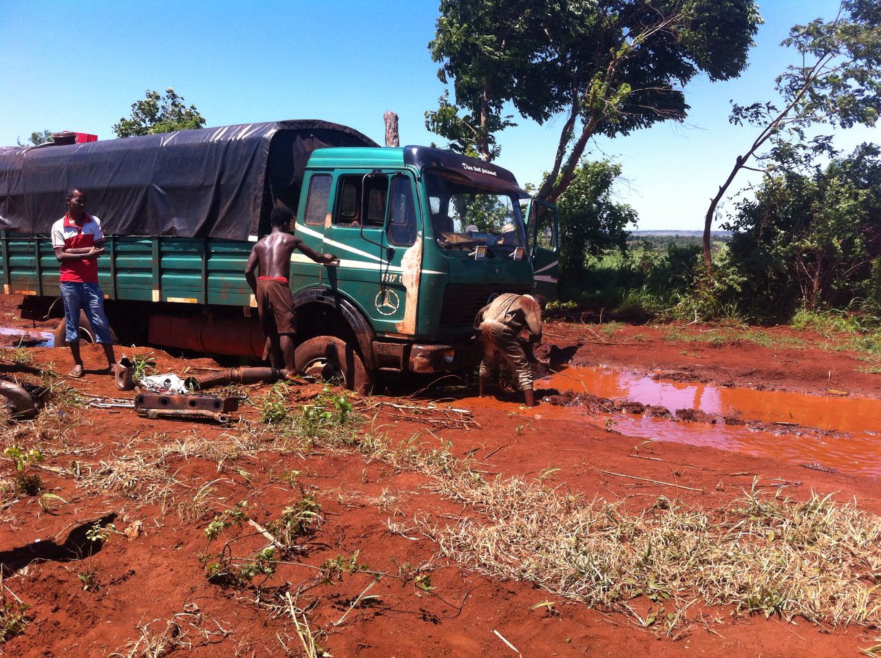 Die Baufirma Somima, die gerade unser Labor baut, ist mit ihrem Lastwagen auch mitten in die Regenzeit hineingerutscht. Buchstäblich.