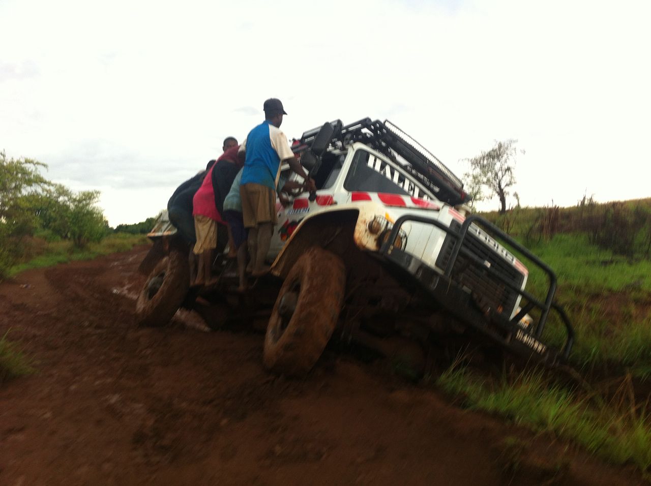 Nachdem der SADKO einmal steckengeblieben ist (er hat sich aber ganz zügig per Seilwinden wieder „selbst herausgezogen“), hat unser Projektdirektor Anatole entschieden, dass Hope-Projekte-Madagaskar pro Jahr ca. 3000 Euro für die Pistenwartung investieren sollte. Das hat auch mit Nachhaltigkeit zu tun: Erstens wird der SADKO geschont (diese Pisten würden ihn innerhalb kurzer Zeit kaputtmachen) und zweitens wird so die sichere Evakuierung der medizinischen Notfälle gewährleistet.