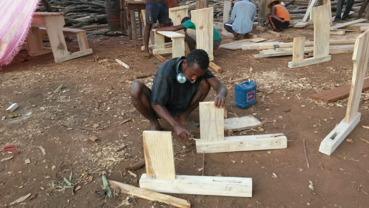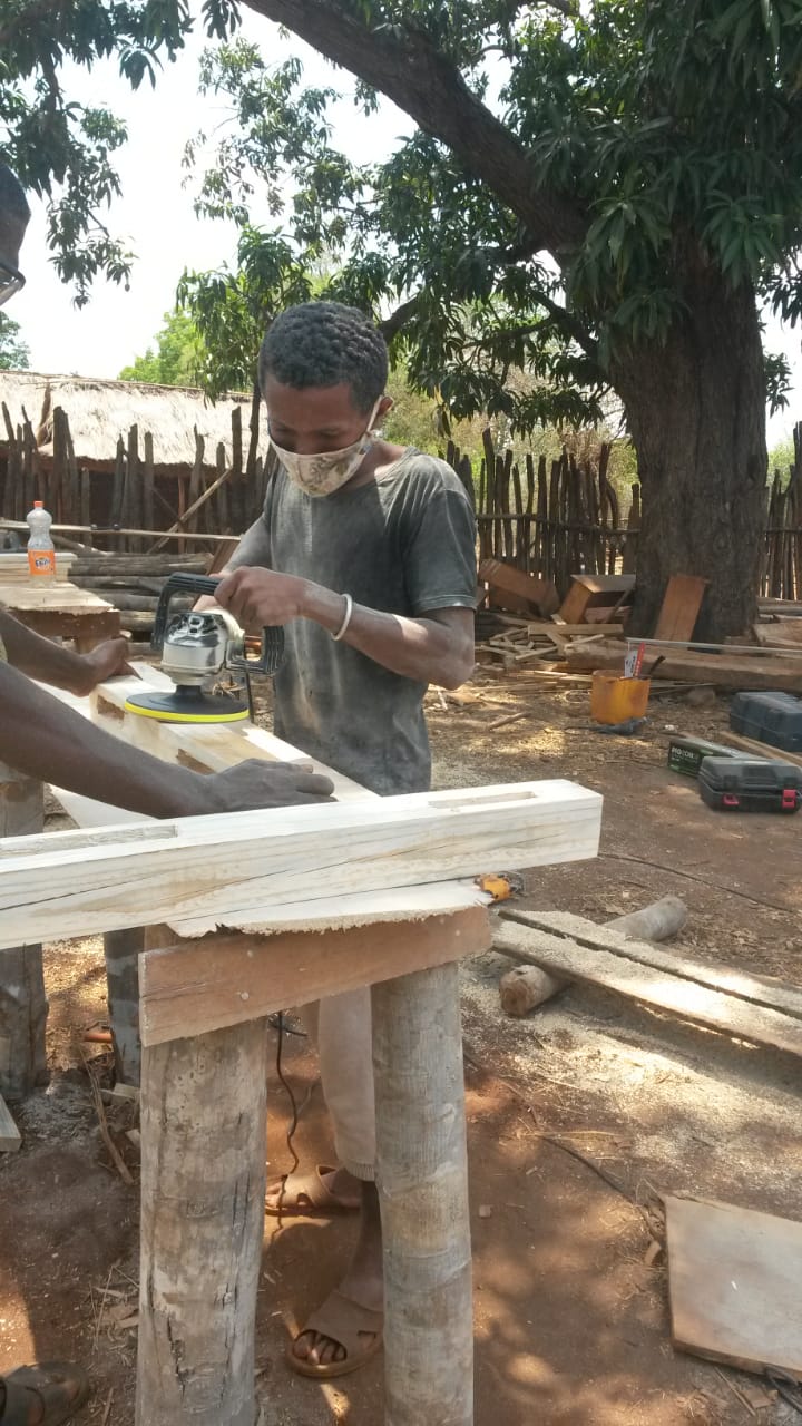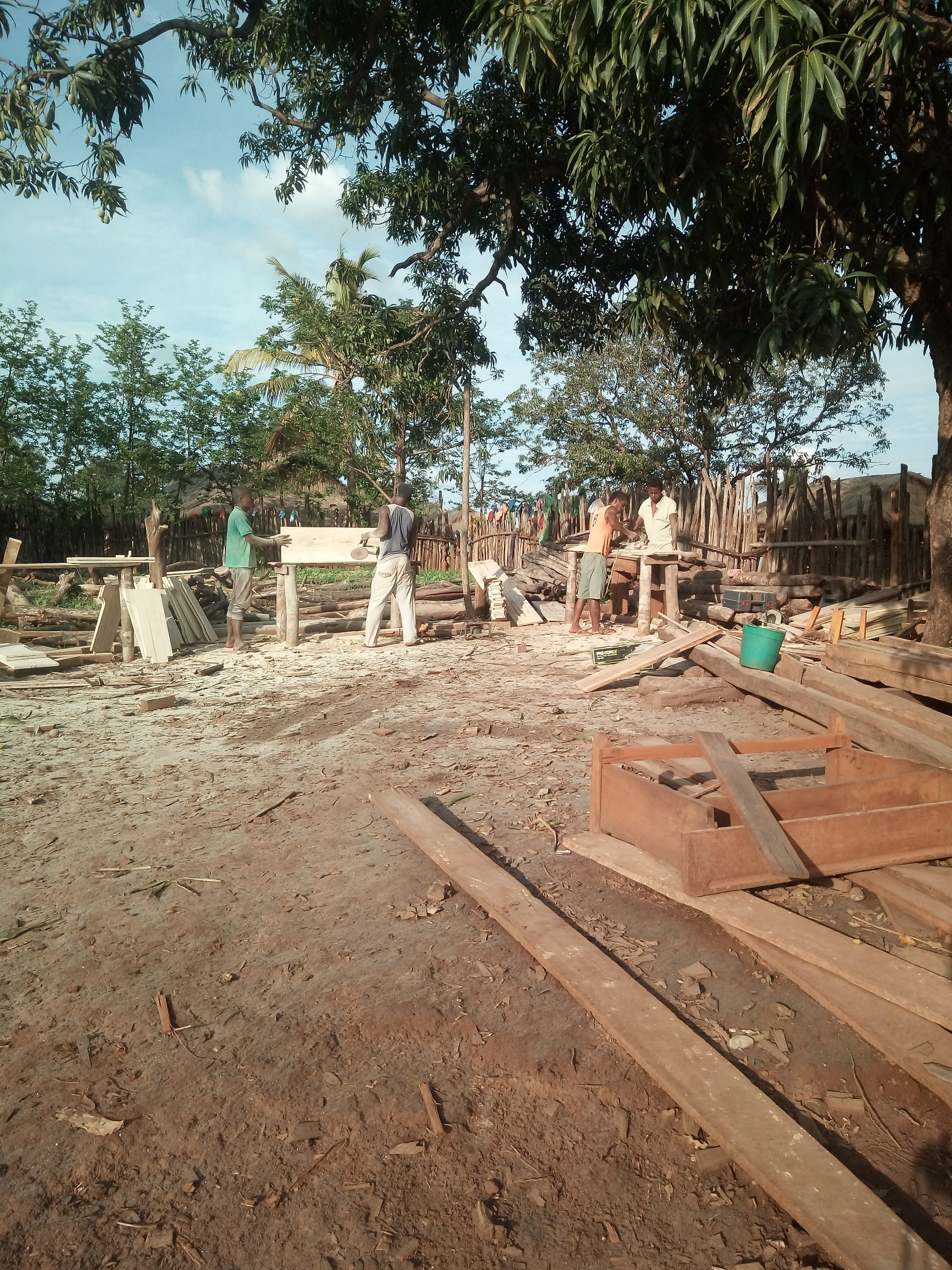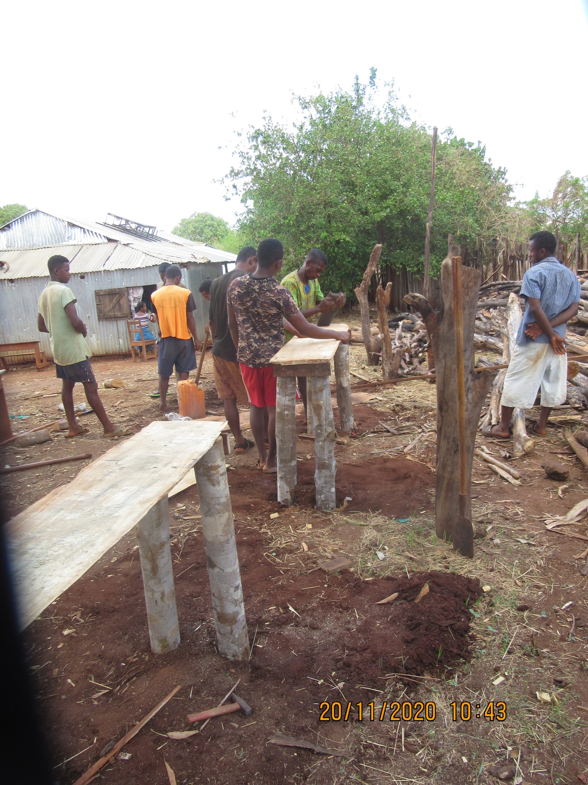 So mussten eben die Mitarbeiter vom Ackerbau-Team, vom Alphabetisierungs -Team und alle sonstigen verfügbaren Mitarbeiter ran. Sie wussten aber auch nicht, wie man Bänke „am Fließband“ produziert. Anatole, unser Missionsdirektor, war gerade vor Ort, hat das gesehen und hat es ihnen gezeigt.