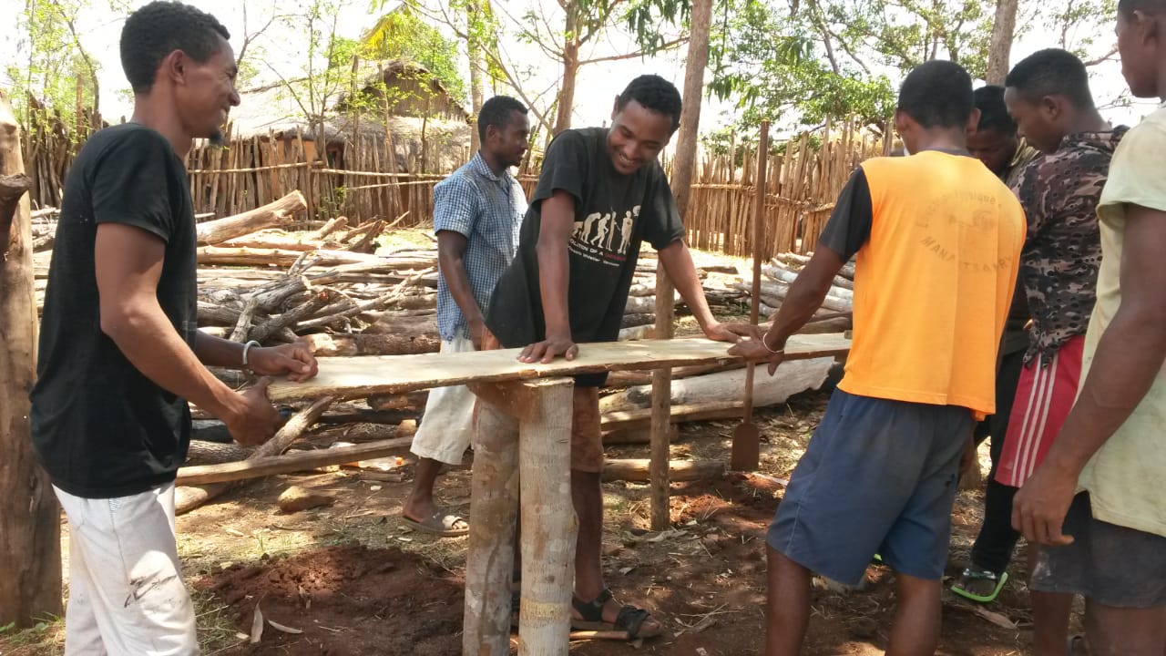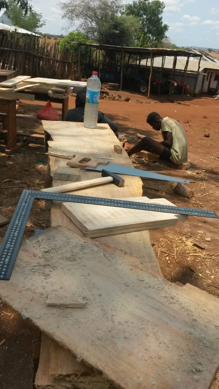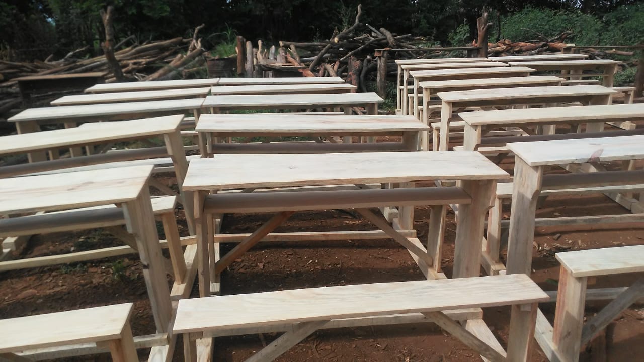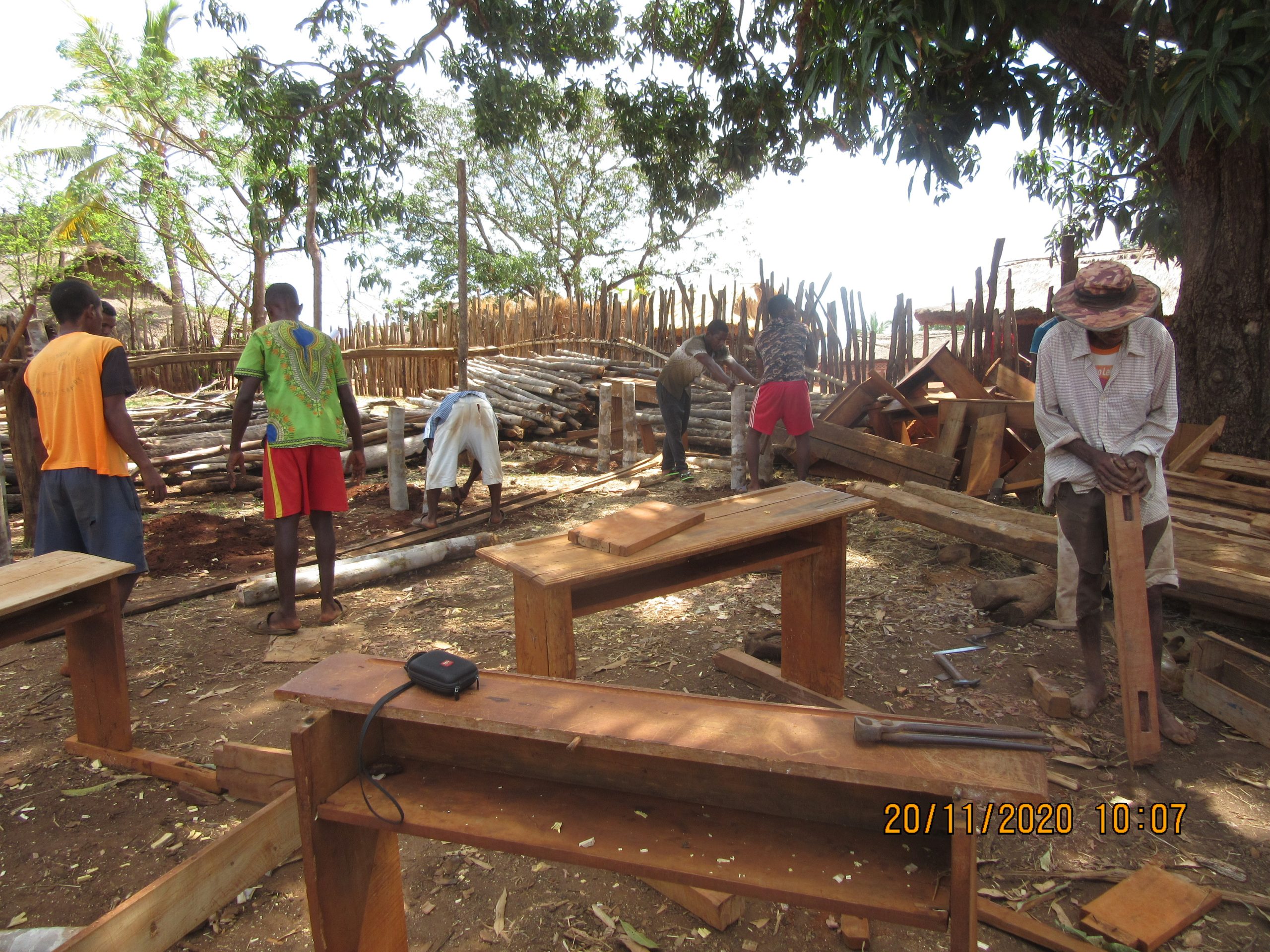 So mussten eben die Mitarbeiter vom Ackerbau-Team, vom Alphabetisierungs -Team und alle sonstigen verfügbaren Mitarbeiter ran. Sie wussten aber auch nicht, wie man Bänke „am Fließband“ produziert. Anatole, unser Missionsdirektor, war gerade vor Ort, hat das gesehen und hat es ihnen gezeigt.