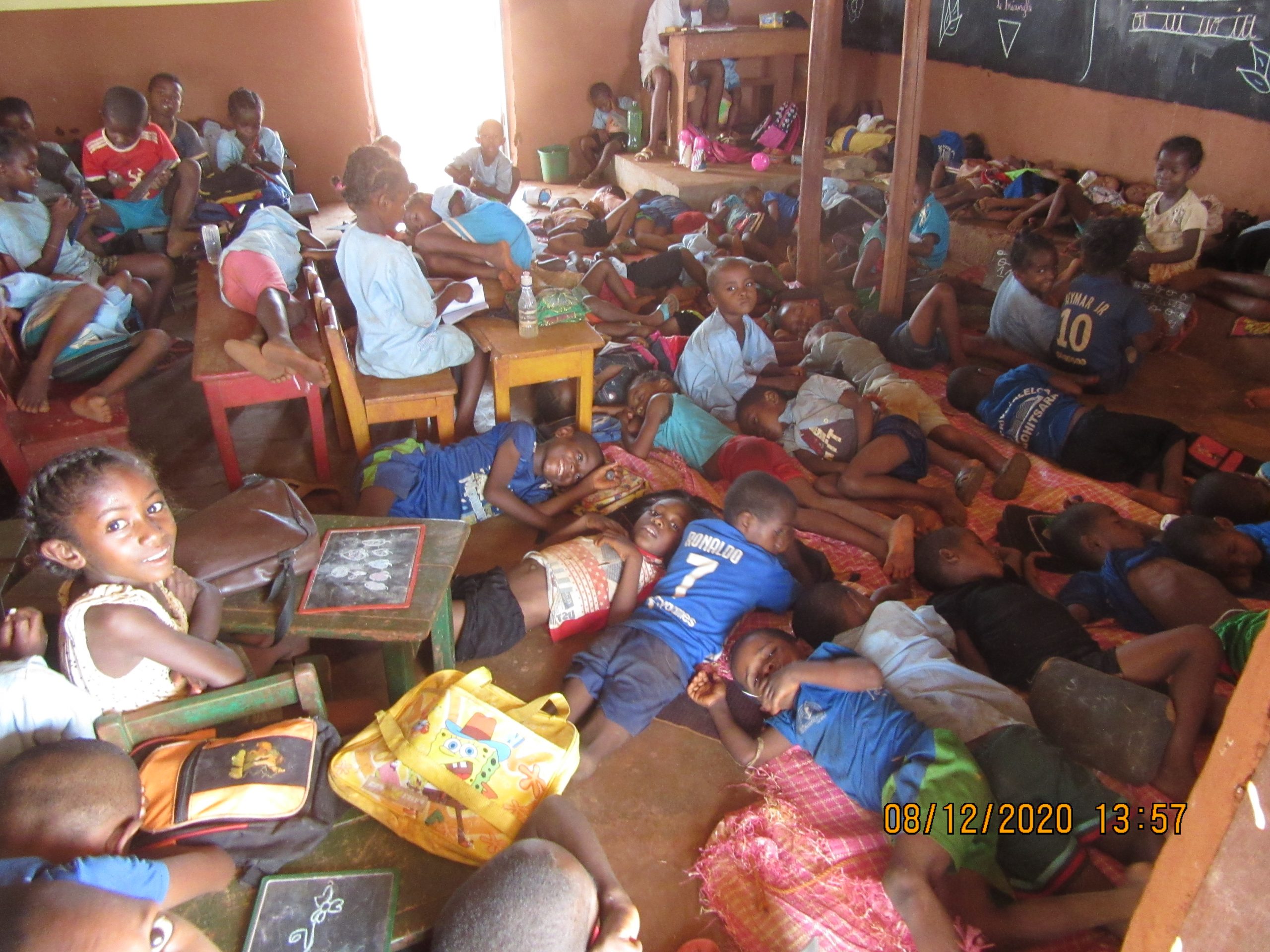 Letztes Schuljahr dagegen mussten alle Schüler, außer denen der 3 Abschlussklassen, wegen Corona das Schuljahr wiederholen. Außer o.g. Klassen war es keinem Schüler oder Lehrer vom Staat her erlaubt, die Schule zu betreten. Deswegen hatten fast alle unsere Schüler letztes Schuljahr faktisch nur 3 Monate Unterricht. Da es keine Möglichkeit von Homeschooling in Ambohitsara gibt und die Kinder zu Hause in Hütten leben, meist ohne Strom, können sie von daheim aus nicht lernen. Es wohnen auch oft ca. 10 Leute in einem Raum, so dass an Lernen nicht zu denken ist. Auch sind die Eltern meist sowieso Analphabeten und können auch nicht helfen.