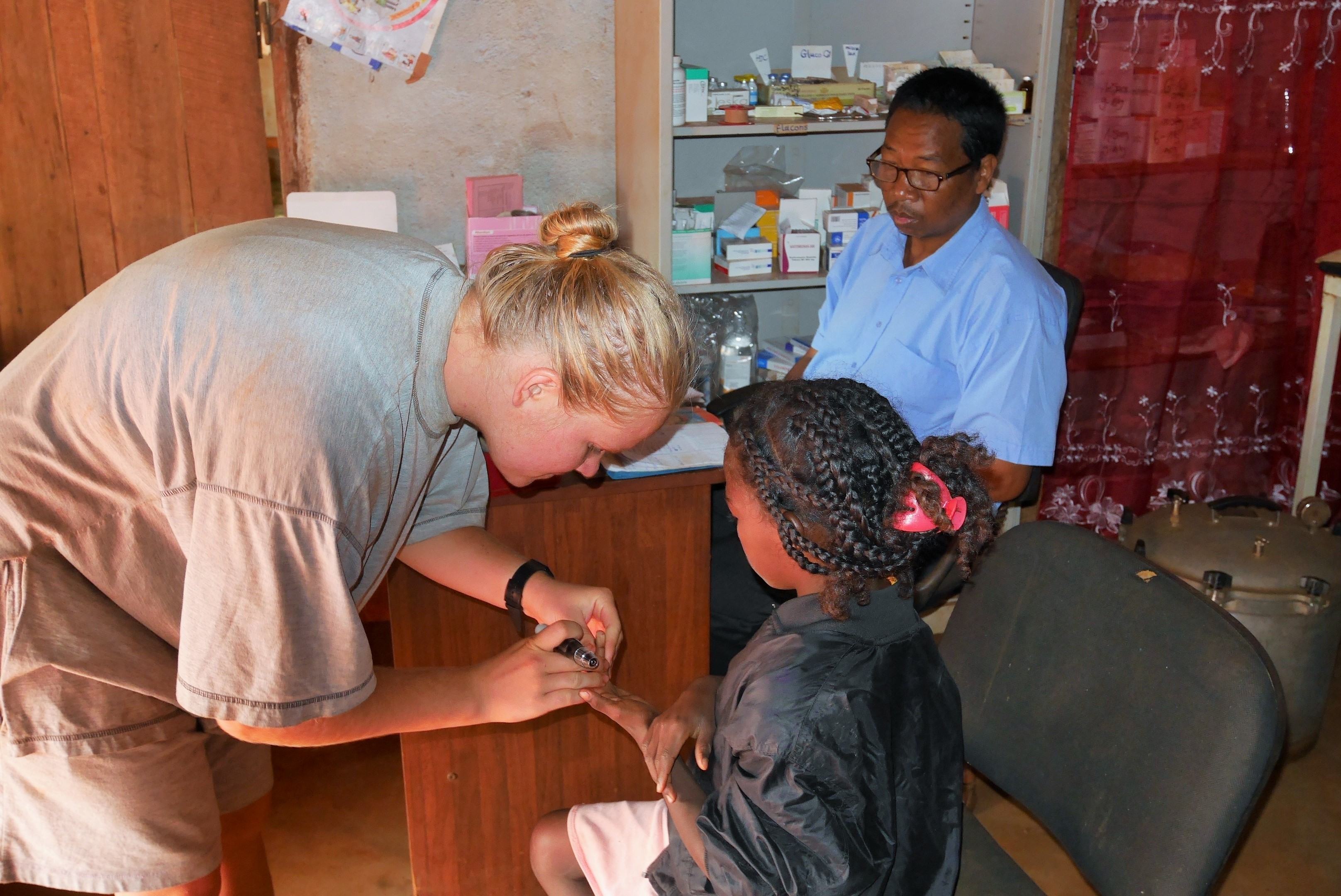 - Und unsere einheimischen Mitarbeiter haben große Pläne: Selbständig wollen sie einen Abzweig von der Wasserstelle nahe der neuen Krankenstation (CSB 2) direkt in das Gebäude des Behandlungsraumes verlegen. So muss man dann bei den Behandlungen kein Wasser mehr vom Wasserhahn zapfen und irgendwo zwischenlagern. Sogar die Entkeimung des Wassers und Abwasserbehandlung sind vorgesehen. Darauf sind sie von ganz alleine gekommen…