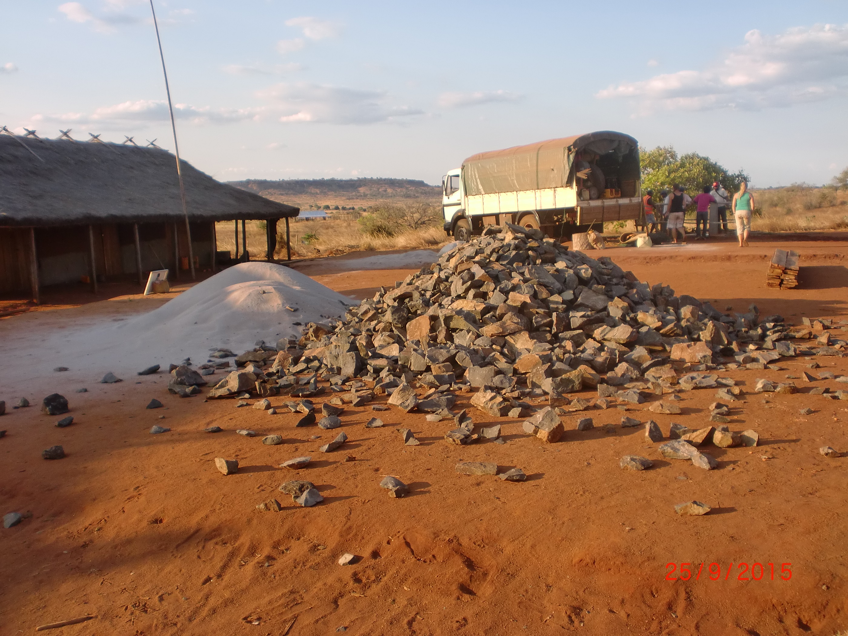 Sie haben auch Sand von der Stelle im Busch, wo wir den immer holen, besorgt. Wir müssen das mühsam per Ochsenkarren transportieren. Mit dem Laster ging das natürlich ruckzuck. Was für ein Segen. Alle Mitarbeiter haben Steine aus dem Fluss gesammelt (für den Staudamm) die dann mit dem LKW zur Baustelle gefahren wurden. Wir alleine hätten für diese Menge Wochen gebraucht.