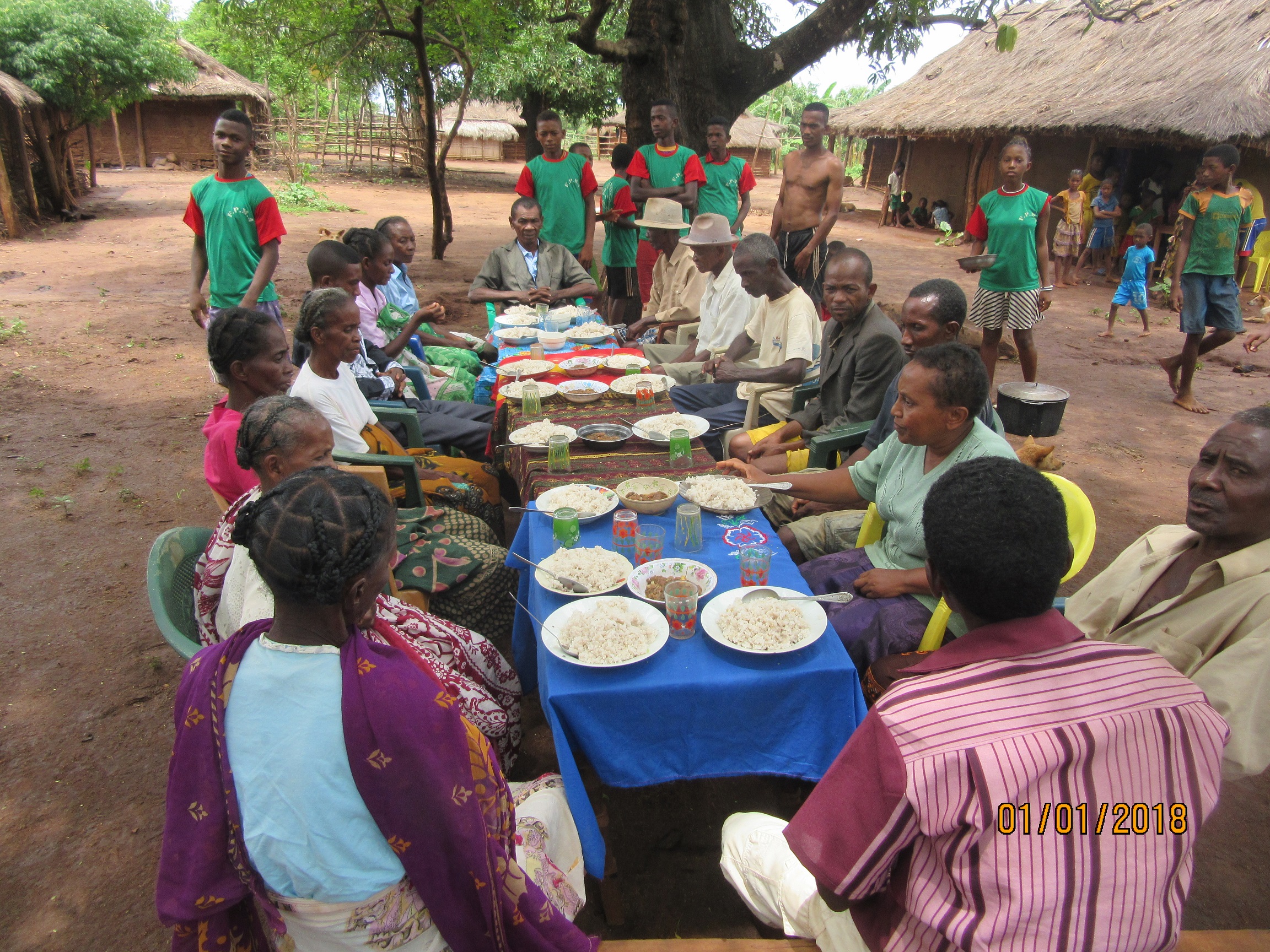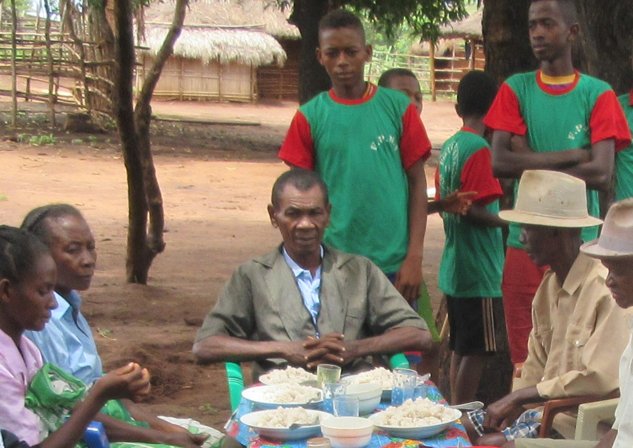 Im Dorf Ambohitsara selber, wurde auch Neujahr gefeiert. Es gibt dort die sog. „Vereinigung Ramarolahy (=viele Jungs)“ – ein Verein von Schülern einer bestimmten Sippe. Diese haben es sich zur Aufgabe gemacht, die Sippe und das ganze Dorf finanziell vorwärts zu bringen. Sie bieten gegen Geld bestimmte Dienstleistungen an: eine Feier organisieren, Bauarbeiten, Reisfeldarbeiten ….Mit dem Erlös tun sie der Sippe/Dorfgemeinschaft etwas Gutes. In diesem Fall haben sie eine Neujahrsfeier im Dorf organisiert. Was bemerkenswert ist: Die Leute vom Dorf sind meistens Anhänger des Ahnenkults. Trotzdem haben die Schüler vor dem Essen mit den Gästen gebetet. Der Präsident dieser Schülervereinigung ist Rarody.